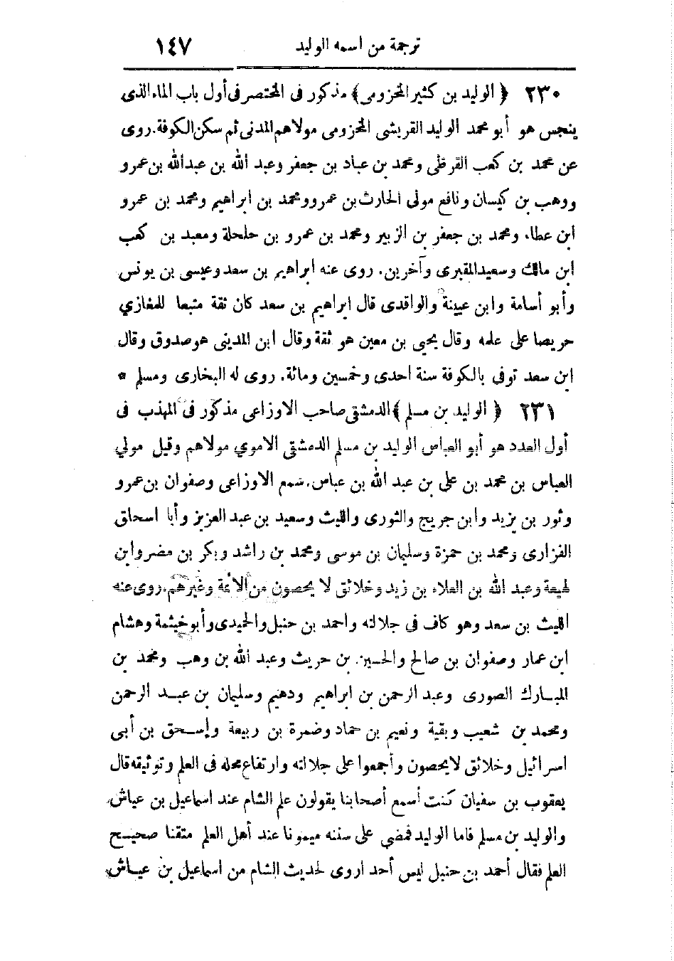 صاحب الأوزاعى. مذكور فى المهذب فى أول العدد. هو أبو العباس الوليد بن مسلم الدمشقى الأموى مولاهم، وقيل: مولى العباس بن محمد بن على بن عبد الله بن عباس. سمع الأوزاعى، وصفوان بن عمرو، وثور بن يزيد، وابن جريج، والثورى، والليث، وسعيد بن عبد العزيز، وأبا إسحاق الفزارى، ومحمد بن حمزة، وسليمان بن موسى، ومحمد بن راشد، وبكر بن مضر، وابن لهيعة، وعبد الله بن العلاء بن زيد، وخلائق لا يحصون من الأئمة وغيرهم.