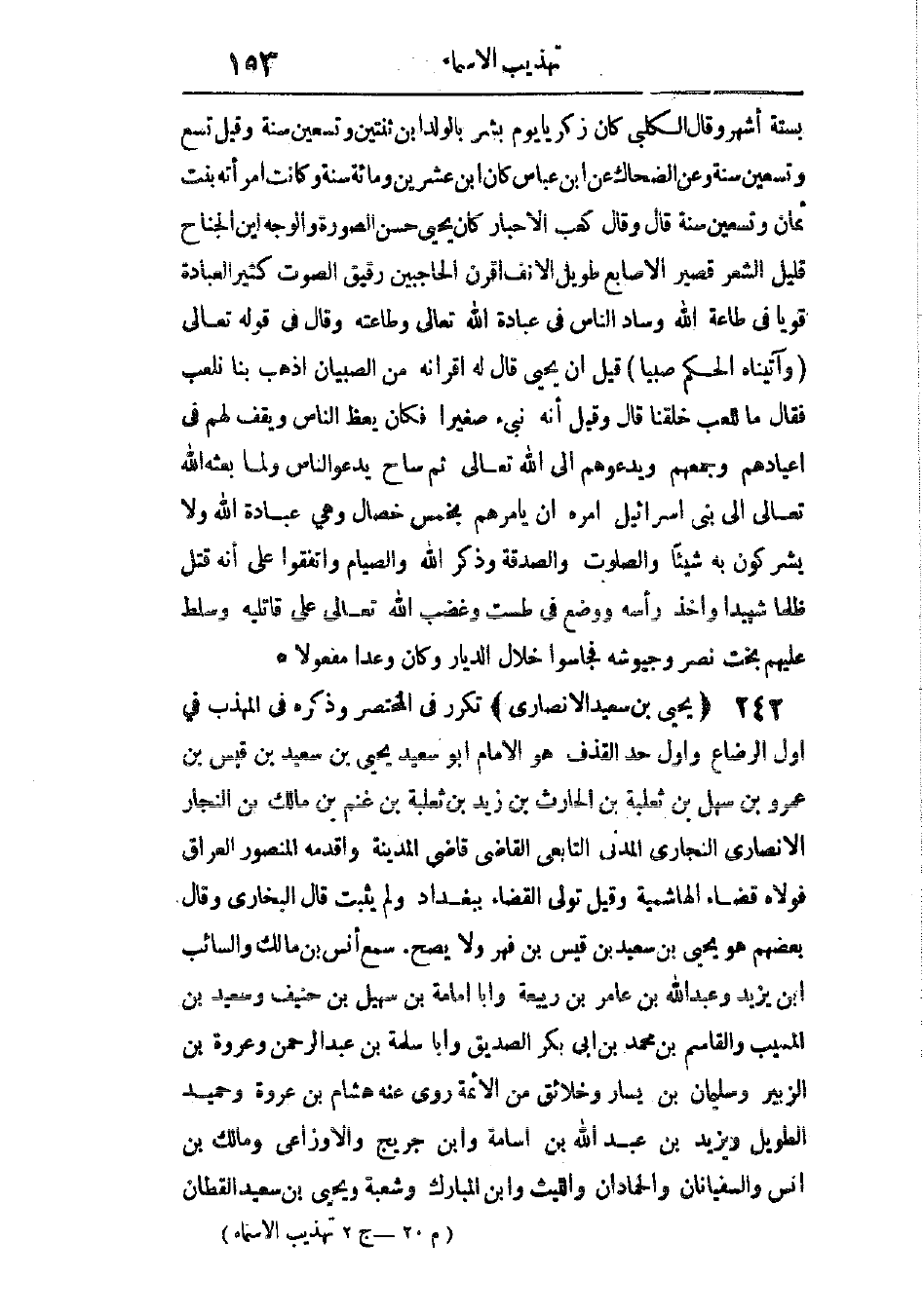 تكرر فى المختصر، وذكره فى المهذب فى أول الرضاع وأول حدث القذف. هو الإمام أبو سعيد يحيى بن سعيد بن قيس بن عمرو بن سهل بن ثعلبة بن الحارث بن زيد ابن ثعلبة بن غنم بن مالك بن النجار الأنصارى النجارى المدنى التابعى القاضى، قاضى المدينة، وأقدمه المنصور العراق، فولاه قضاء الهاشمية، وقيل: تولى القضاء ببغداد ولم يثبت. قال البخارى: وقال بعضهم: هو يحيى بن سعيد بن قيس بن فهر، ولا يصح.