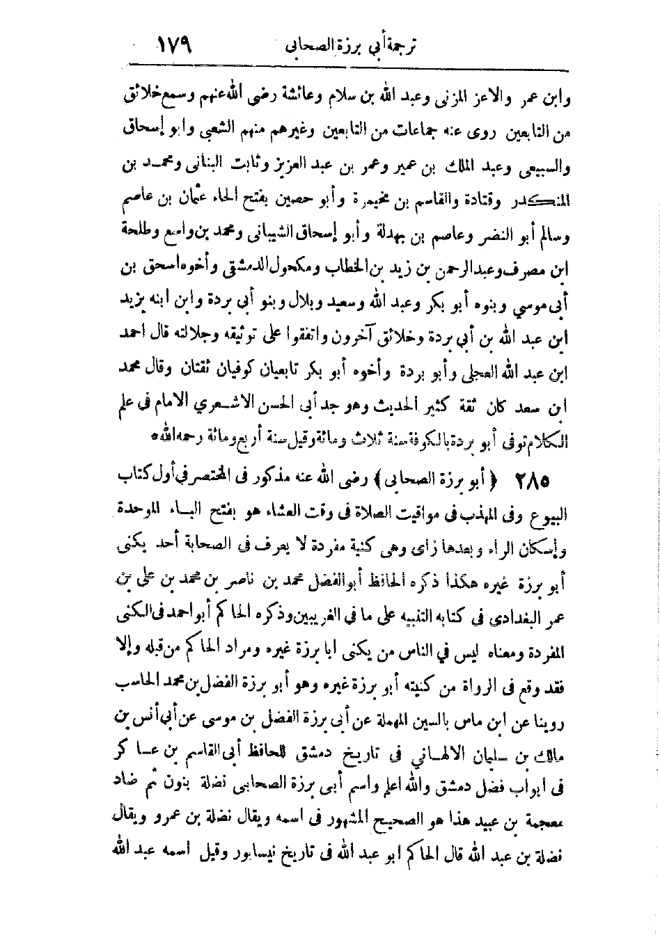 واسم أبى برزة الصحابى: نضلة، بنون ثم ضاد معجمة، ابن عبيد، هذا هو الصحيح المشهور فى اسمه، ويقال: نضلة بن عمرو، ويقال: نضلة بن عبد الله. قال الحاكم أبو عبد الله فى تاريخ نيسابور، وقيل: اسمه عبد الله