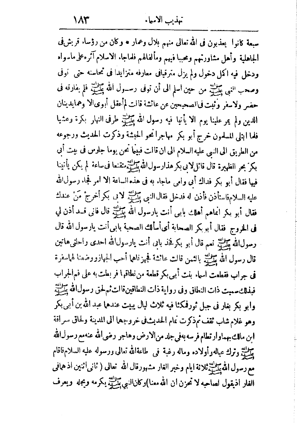 وذكرت الحديث ورجوعه من الطريق إلى النبى - صَلَّى اللهُ عَلَيْهِ وَسَلَّمَ -، إلى أن قالت: فبينما نحن يومًا جلوس فى بيت أبى بكر بحر الظهيرة، قال قاتئل لأبى بكر: هذا رسول الله - صَلَّى اللهُ عَلَيْهِ وَسَلَّمَ - متقنعًا فى ساعة لم يكن يأتينا فيها، فقال أبو بكر: فداك أبى وأمى، ما جاء به فى هذه الساعة إلا أمر، فجاء رسول الله - صَلَّى اللهُ عَلَيْهِ وَسَلَّمَ - فاستأذن فأذن له فدخل، فقال النبى - صَلَّى اللهُ عَلَيْهِ وَسَلَّمَ - لأبى بكر: “أخرج مَنْ عندك”، فقال أبو بكر: إنما هم أهلك بأبى أنت يا رسول الله - صَلَّى اللهُ عَلَيْهِ وَسَلَّمَ -، قال: “فإنى قد أُذِنَ لى فى الخروج”، فقال أبو بكر: الصحابة، أى أسألك الصُّحْبَة، بأبى أنت يا رسول الله، قال رسول الله - صَلَّى اللهُ عَلَيْهِ وَسَلَّمَ -: “نعم”، قال أبو بكر: فخذ بأبى أنت يا رسول الله إحدى راحلتى هاتين، قال رسول الله - صَلَّى اللهُ عَلَيْهِ وَسَلَّمَ -: “بالثمن”.