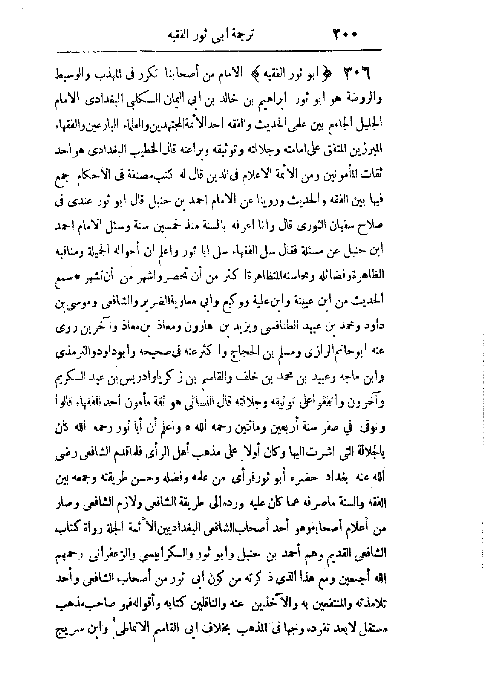واعلم أن أبا ثور، رحمه الله، كان بالجلالة التى أشرت إليها، وكان أولاً على مذهب أهل الرأى، فلما قدم الشافعى، رضى الله عنه، بغداد حضره أبو ثور، فرأى من علمه وفضله وحسن طريقته وجمعه بين الفقه والسنة ما صرفه عما كان عليه، ورده إلى طريقة الشافعى، ولازم الشافعى، وصار من أعلام أصحابه، وهو أحد أصحاب الشافعى البغداديين الأئمة الجلة، رواة كتاب الشافعى القديم، وهم أحمد بن حنبل، وأبو ثور، والكرابيسى، والزعفرانى، رحمهم الله أجمعين.