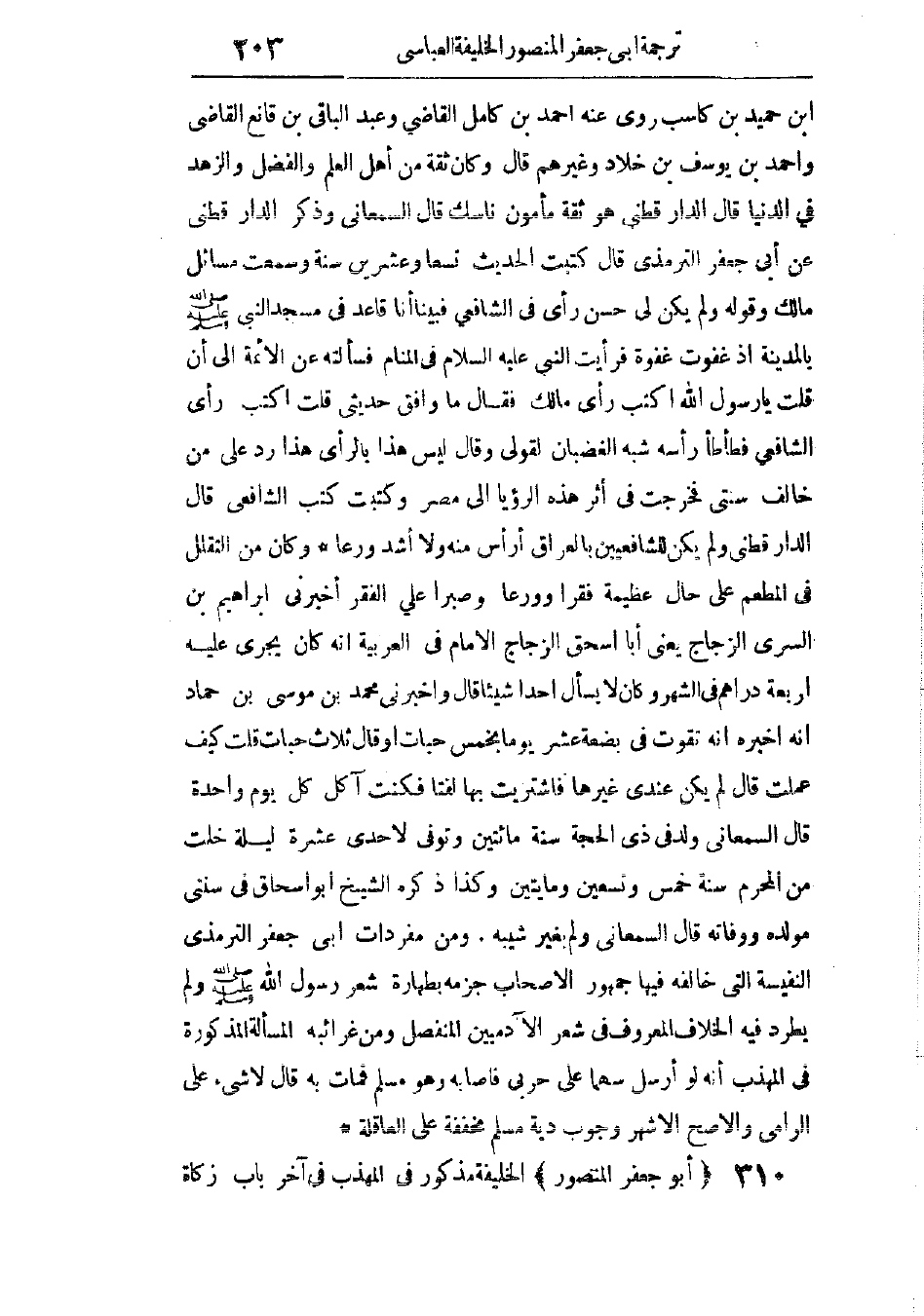 ومن مفردات أبى جعفر الترمذى النفيسة التى خالفه فيها جمهور الأصحاب، جزمه بطهارة شعر رسول الله - صَلَّى اللهُ عَلَيْهِ وَسَلَّمَ -، ولم يطرد فيه الخلاف المعروف فى شعر الآدميين المنفصل، ومن غرائبه المسألة المذكورة فى المهذب أنه لو أرسل سهمًا على حربى فأصابه وهو مسلم فمات به، قال: لا شىء على الرامى، والأصح الأشهر وجوب دية مسلم مخففة على العاقلة.