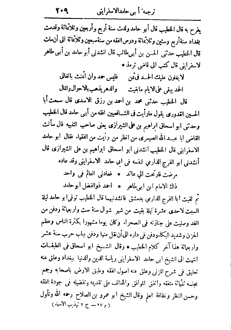 قال الخطيب: أنشدنى أبو إسحاق إبراهيم بن على الشيرازى، قال: أنشدنى أبو الفرج الدارمى لنفسه فى أبى حامد الأسفراينى وقد عاده: