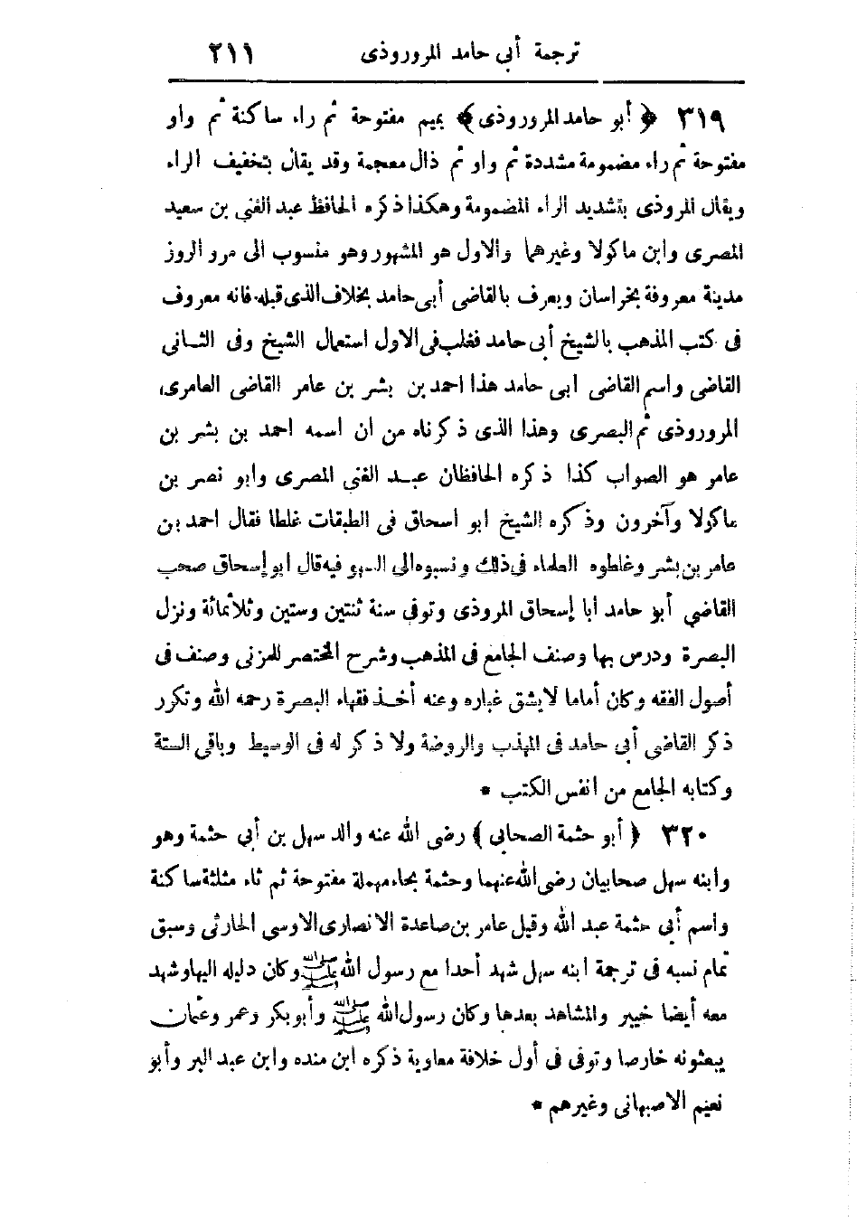 واسم القاضى أبى حامد هذا أحمد بن بشر بن عامر القاضى العامرى المروروذى، ثم البصرى، وهذا الذى ذكرناه من أن اسمه أحمد بن بشر بن عامر هو الصواب، كذا ذكره الحافظان عبد الغنى المصرى، وأبو نصر بن ماكولا، وآخرون. وذكره الشيخ أبو إسحاق فى الطبقات غلطًا، فقال: أحمد بن عامر بن بشر، وغلطوه العلماء فى ذلك، ونسبوه إلى السهو فيه.