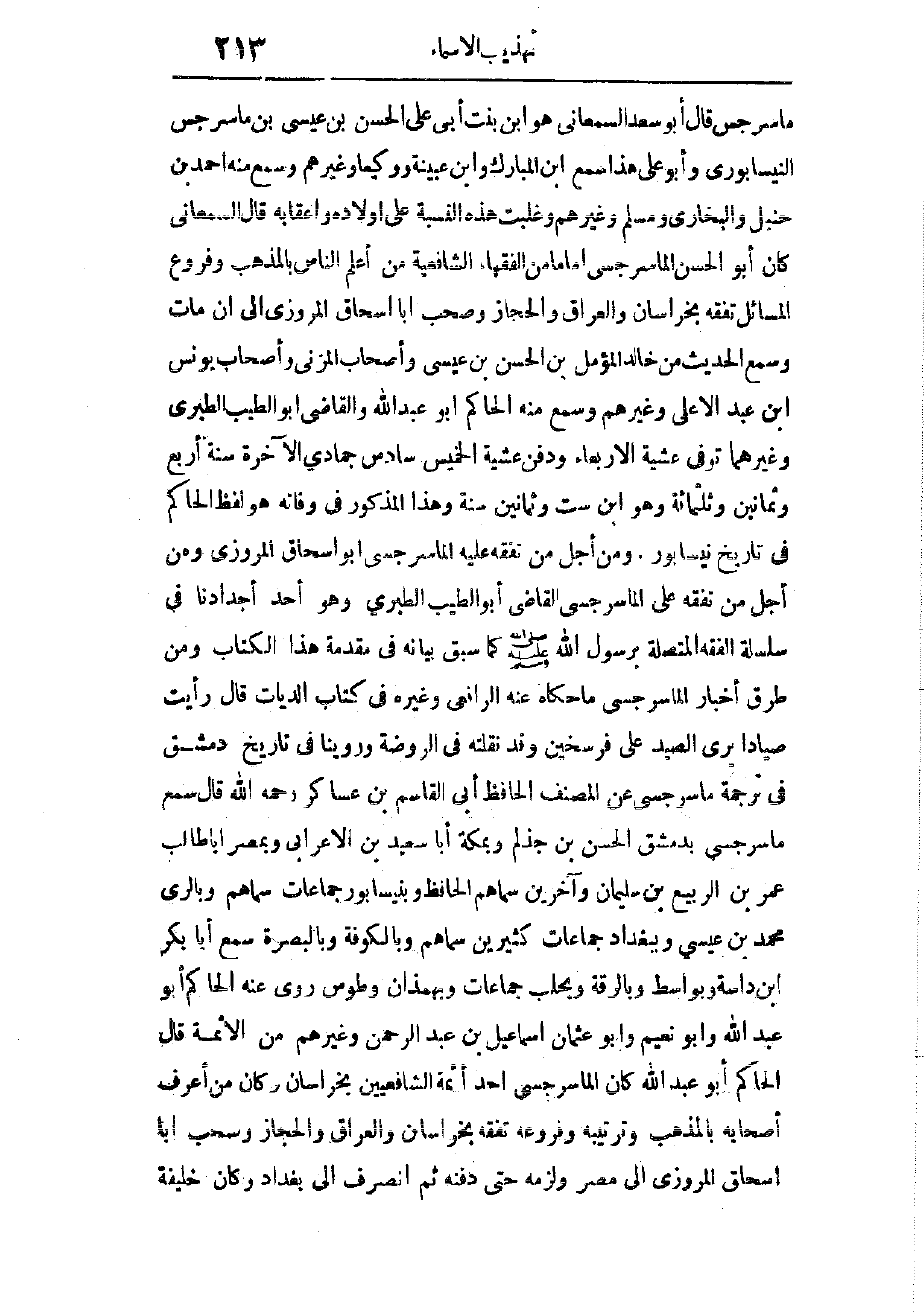ومن طرق أخبار الماسرجسى ما حكاه عنه الرافعى وغيره فى كتاب الديات، قال: رأيت صيادًا يرى الصيد على فرسخين. وقد نقلته فى الروضة. وروينا فى تاريخ دمشق فى ترجمة الماسرجسى عن المصنف الحافظ أبى القاسم بن عساكر، رحمه الله، قال: سمع الماسرجسى بدمشق الحسن بن جذلم، وبمكة أبا سعيد بن الأعرابى، وبمصر أبا طالب عمر بن الربيع بن سليمان، وآخرين سماهم الحافظ، وبنيسابور جماعات سماهم، وبالرى محمد بن عيسى، وببغداد جماعات كثيرين سماهم، وبالكوفة وبالبصرة سمع أبا بكر بن داسة، وبواسط وبالرقة وبحلب جماعات، وبهمذان وطوس. روى عنه الحاكم أبو عبد الله، وأبو نعيم، وأبو عثمان إسماعيل بن عبد الرحمن، وغيرهم من الأئمة.
