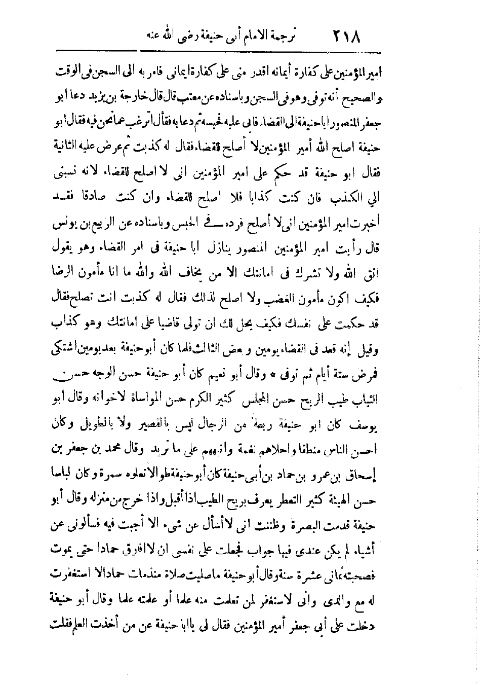 حنيفة: أمير المؤمنين على كفارة أيمانه أقدر منى على كفارة أيمانى، فأمر به إلى السجن فى الوقت. والصحيح أنه توفى وهو فى السجن.