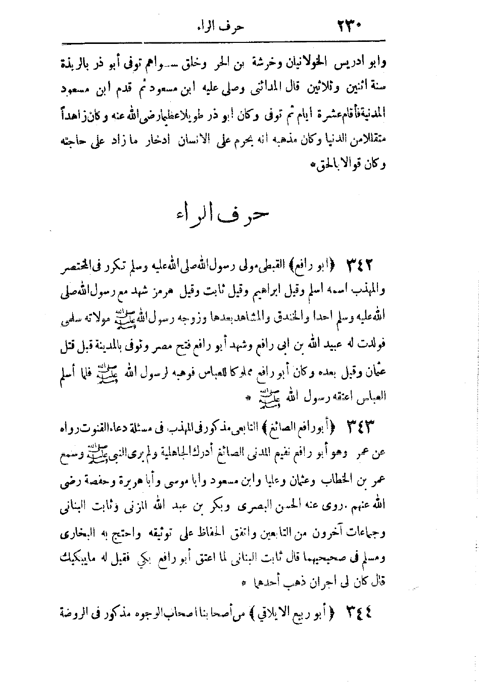 مذكور فى المهذب فى مسألة دعاء القنوت، رواه عن عمر، وهو أبو رافع نفيع المدنى الصائغ، أدرك الجاهلية، ولم يرى النبى - صَلَّى اللهُ عَلَيْهِ وَسَلَّمَ -، وسمع عمر بن الخطاب، وعثمان، وعليًا، وابن مسعود، وأبا موسى، وأبا هريرة، وحفصة، رضى الله عنهم. روى عنه الحسن البصرى، وبكر بن عبد الله المزنى، وثابت البنانى، وجماعات آخرون من التابعين، واتفق الحفاظ على توثيقه، واحتج به البخارى ومسلم فى صحيحيهما. قال ثابت البنانى: لما أُعتق أبو رافع بكى، فقيل له: ما يبكيك؟ قال: كان لى أجران ذهب أحدهما.