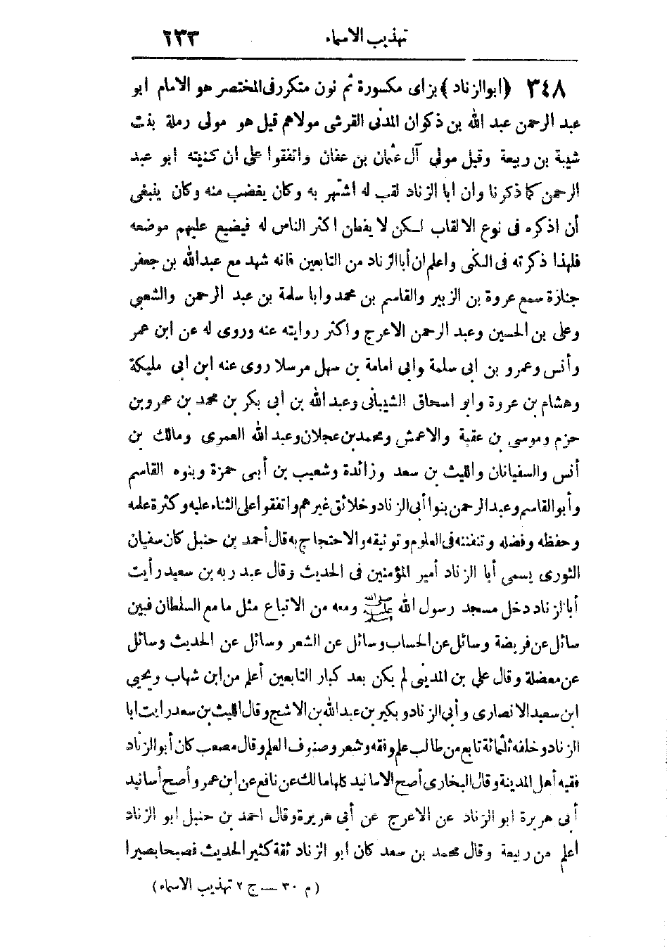 بزاى مكسورة، ثم النون. تكرر فى المختصر. هو الإمام أبو عبد الرحمن عبد الله بن ذكوان المدنى القرشى مولاهم، قيل: هو مولى رملة بنت شيبة بن ربيعة، وقيل: مولى آل عثمان بن عفان، واتفقوا على أن كنيته أبو عبد الرحمن كما ذكرنا، وأن أبا الزناد لقب له، اشتهر به، وكان يغضب منه، وكان ينبغى أن أذكره فى نوع الألقاب، لكن لا يفطن أكثر الناس له فيضيع عليهم موضعه، فلهذا ذكرته فى الكنى.