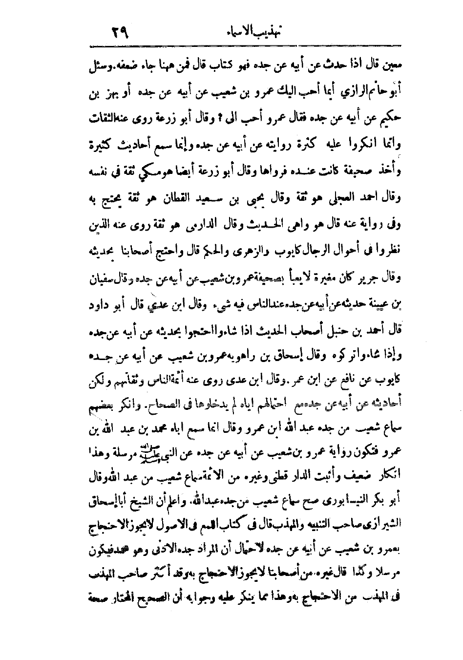 واعلم أن الشيخ أبا إسحاق الشيرازى صاحب التنبيه والمهذب قال فى كتاب اللمع فى الأصول: لا يجوز الاحتجاج بعمرو بن شعيب عن أبيه عن جده؛ لاحتمال أن المراد جده الأدنى، وهو محمد، فيكون مرسلاً، وكذا قال غيره من أصحابنا: لا يجوز الاحتجاج به، وقد أكثر صاحب المهذب فى المهذب من الاحتجاج به، وهذا مما يُنكر عليه، وجوابه أن الصحيح المختار صحة