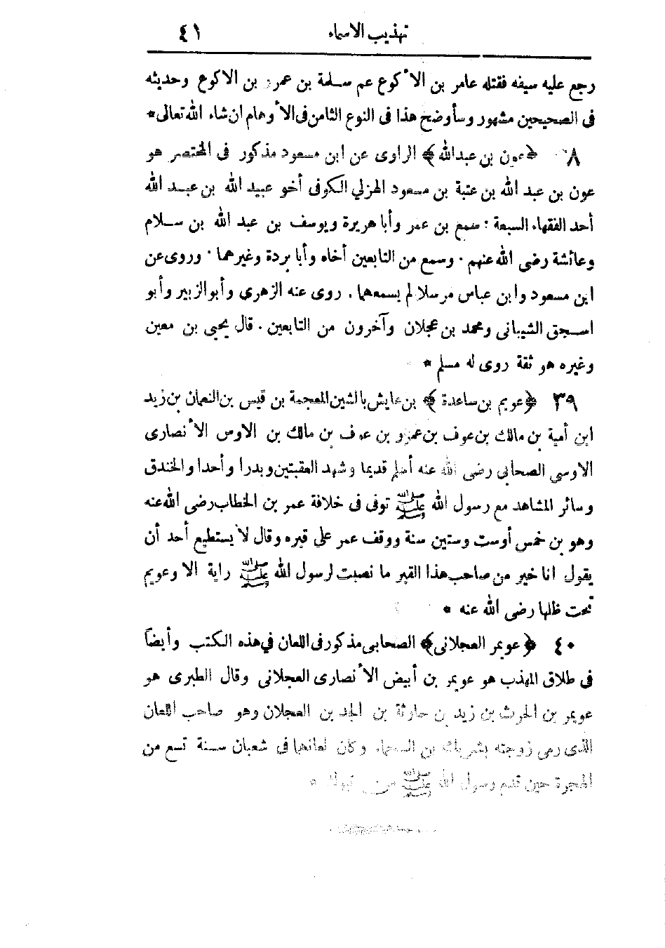 مذكور فى اللعان فى هذه الكتب، وأيضًا فى طلاق المهذب. هو عويمر بن أبيض الأنصارى العجلانى. وقال الطبرى: هو عويمر بن الحارث بن زيد بن حارثة بن الجد بن العجلان، وهو صاحب اللعان الذى رمى زوجته بشريك بن السحماء، وكان لعانهما فى شعبان سنة تسع من الهجرة حين قدم رسول الله - صَلَّى اللهُ عَلَيْهِ وَسَلَّمَ - من تبوك.