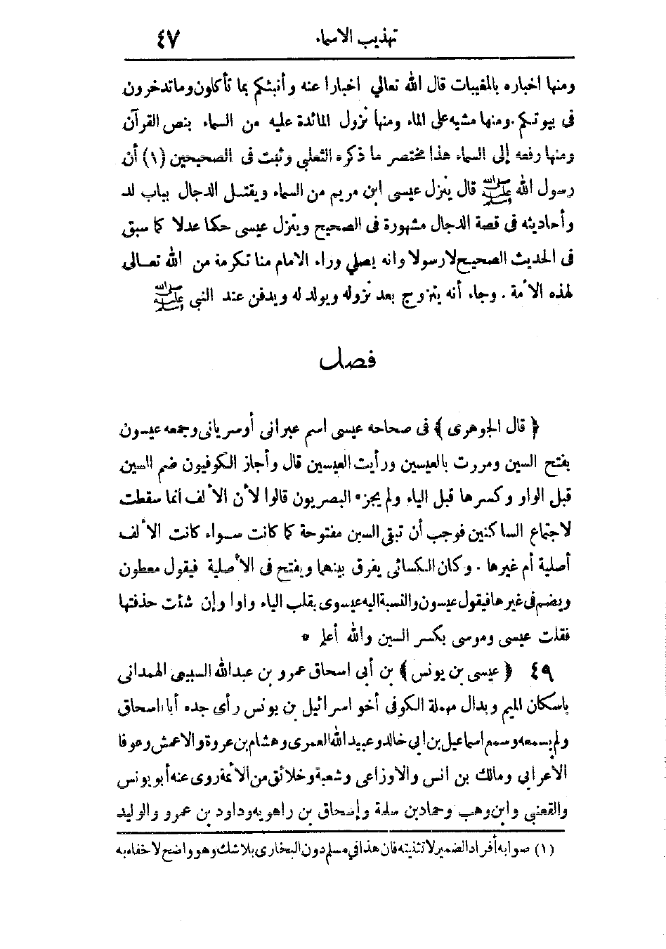 وثبت فى الصحيحين أن رسول الله - صَلَّى اللهُ عَلَيْهِ وَسَلَّمَ - قال: "ينزل عيسى ابن مريم من السماء، ويقتل الدجال بباب لد" (¬1) . وأحاديثه فى قصة الدجال مشهورة فى الصحيح، وينزل عيسى حكمًا عدلاً كما سبق فى الحديث الصحيح لا رسولاً، وأنه يصلى وراء الإمام منا تكرمة من الله تعالى لهذه الأمة. وجاء أنه يتزوج بعد نزوله، ويُولد له، ويدفن عند النبى - صَلَّى اللهُ عَلَيْهِ وَسَلَّمَ -.