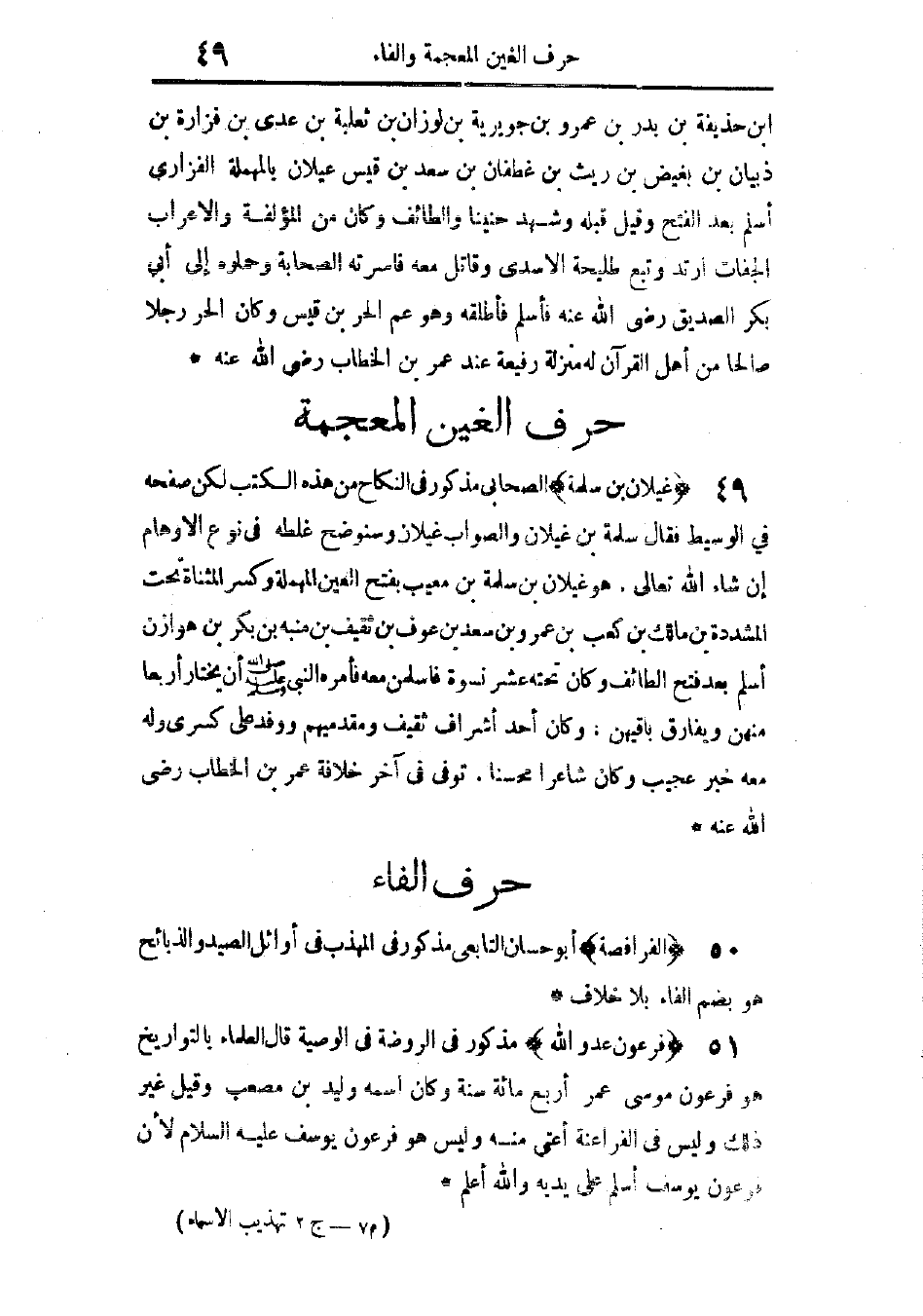 مذكور فى النكاح من هذه الكتب، لكن صحفه فى الوسيط، فقال: سلمة بن غيلان، والصواب غيلان، وسنوضح غلطه فى نوع الأوهام إن شاء الله تعالى. هو غيلان بن سلمة بن معيب، بفتح العين المهملة، وكسر المثناة تحت المشددة، ابن مالك بن كعب بن عمرو بن سعد بن عوف بن ثقيف بن منبه بن بكر بن هوازن. أسلم بعد فتح الطائف، وكان تحته عشر نسوة فأسلمن معه، فأمره النبى - صَلَّى اللهُ عَلَيْهِ وَسَلَّمَ - أن يختار أربعًا منهن، ويفارق باقيهن، وكان أحد أشراف ثقيف ومقدميهم، ووفد على كسرى وله معه خبر عجيب، وكان شاعرًا محسنًا. توفى فى آخر خلافة عمر بن الخطاب، رضى الله عنه.