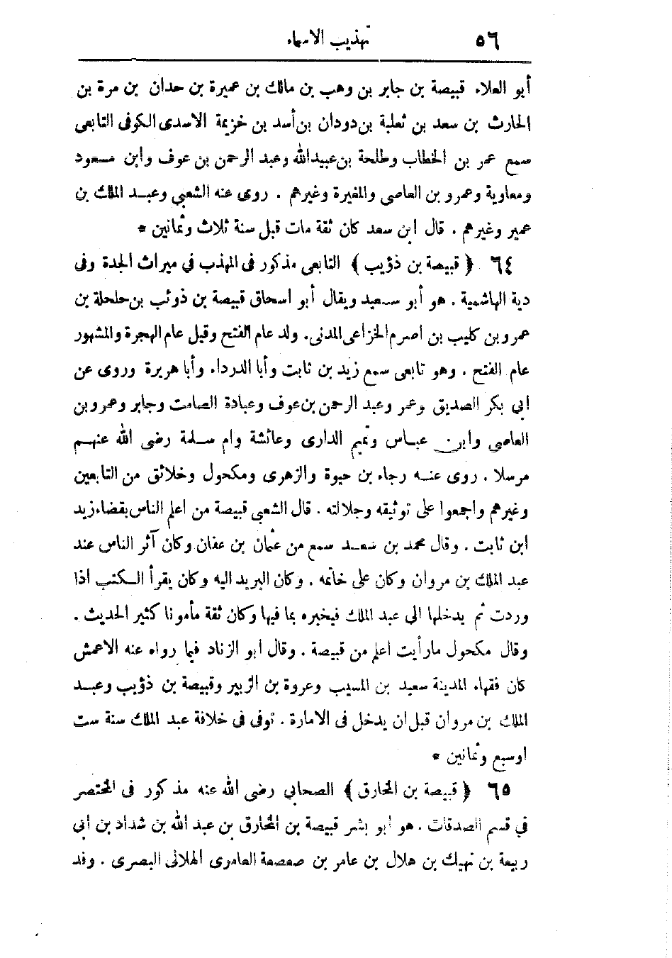 مذكور فى المهذب فى ميراث الجدة، وفى دية الهاشمية. هو أبو سعيد، ويقال: أبو إسحاق قبيصة بن ذؤيب بن حلحلة بن عمرو بن كليب بن أصرم الخزاعى المدنى. ولد عام الفتح، وقيل: عام الهجرة، والمشهور عام الفتح. وهو تابعى، سمع زيد بن ثابت، وأبا الدرداء، وأبا هريرة. روى عن أبى بكر الصديق، وعمر، وعبد الرحمن بن عوف، وعبادة بن الصامت، وجابر، وعمرو بن العاص، وابن عباس، وتميم الدارى، وعائشة، وأم سلمة، رضى الله عنهم، مرسلاً. روى عنه رجاء بن حيوة، والزهرى، ومكحول، وخلائق من التابعين وغيرهم، وأجمعوا على توثيقه وجلالته.