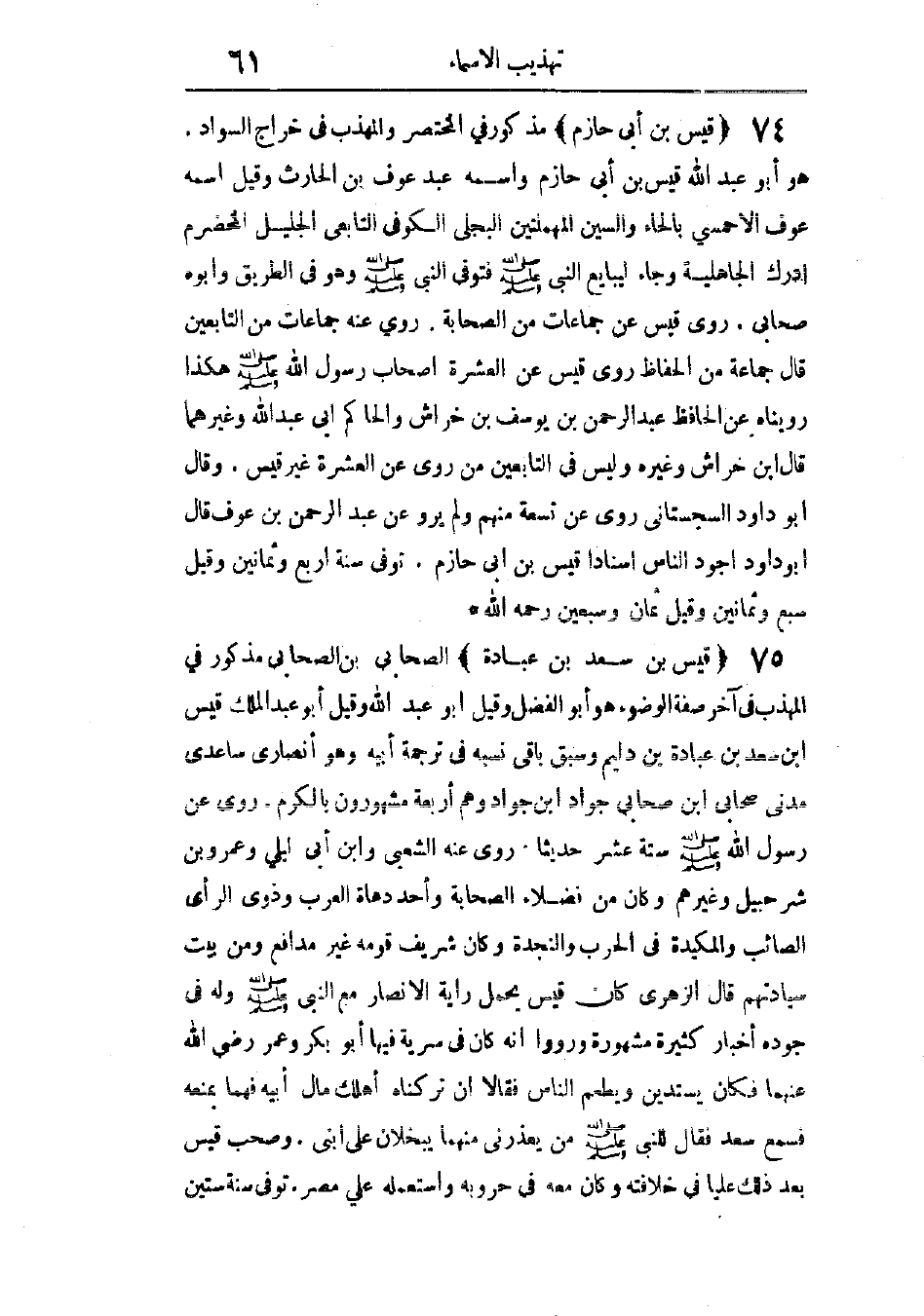الصحابى ابن الصحابى. مذكور فى المهذب فى آخر صفة الوضوء. هو أبو الفضل، وقيل: أبو عبد الله، وقيل: أبو عبد الملك قيس بن سعد بن عبادة بن دليم، وسبق باقى نسبه فى ترجمة أبيه. وهو أنصارى، ساعدى، مدنى، صحابى ابن صحابى، جواد ابن جواد، وهم أربعة مشهورون بالكرم.