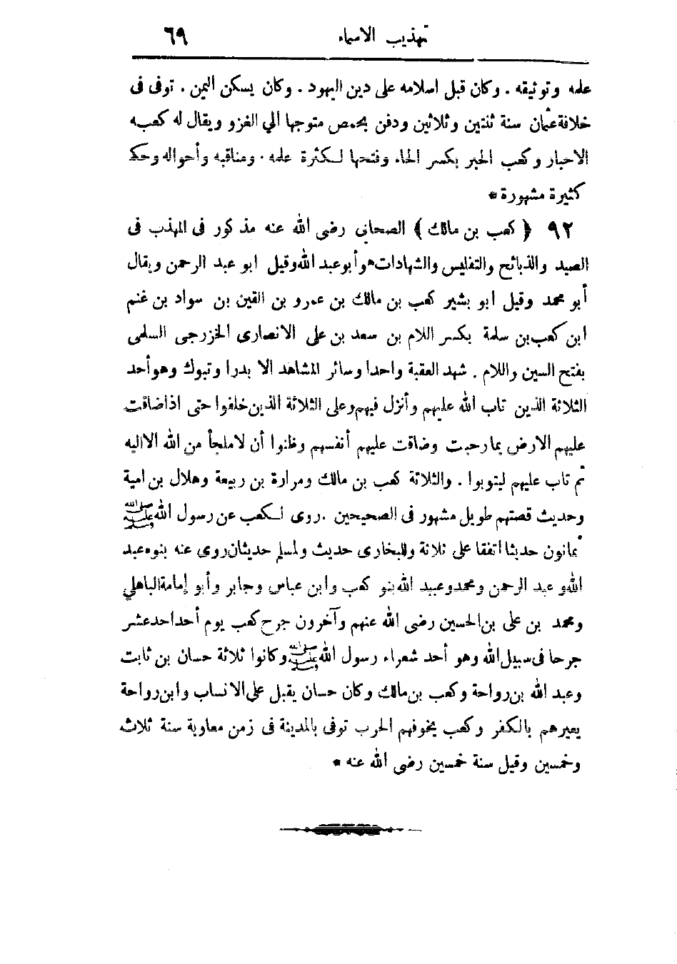 مذكور فى المهذب فى الصيد، والذبائح، والتفليس، والشهادات. هو أبو عبد الله، وقيل: أبو عبد الرحمن، ويقال: أبو محمد، وقيل: أبو بشير كعب بن مالك بن عمرو بن القين بن سواد بن غنم بن كعب بن سلمة، بكسر اللام، ابن سعد بن على الأنصارى الخزرجى السلمى، بفتح السين واللام.