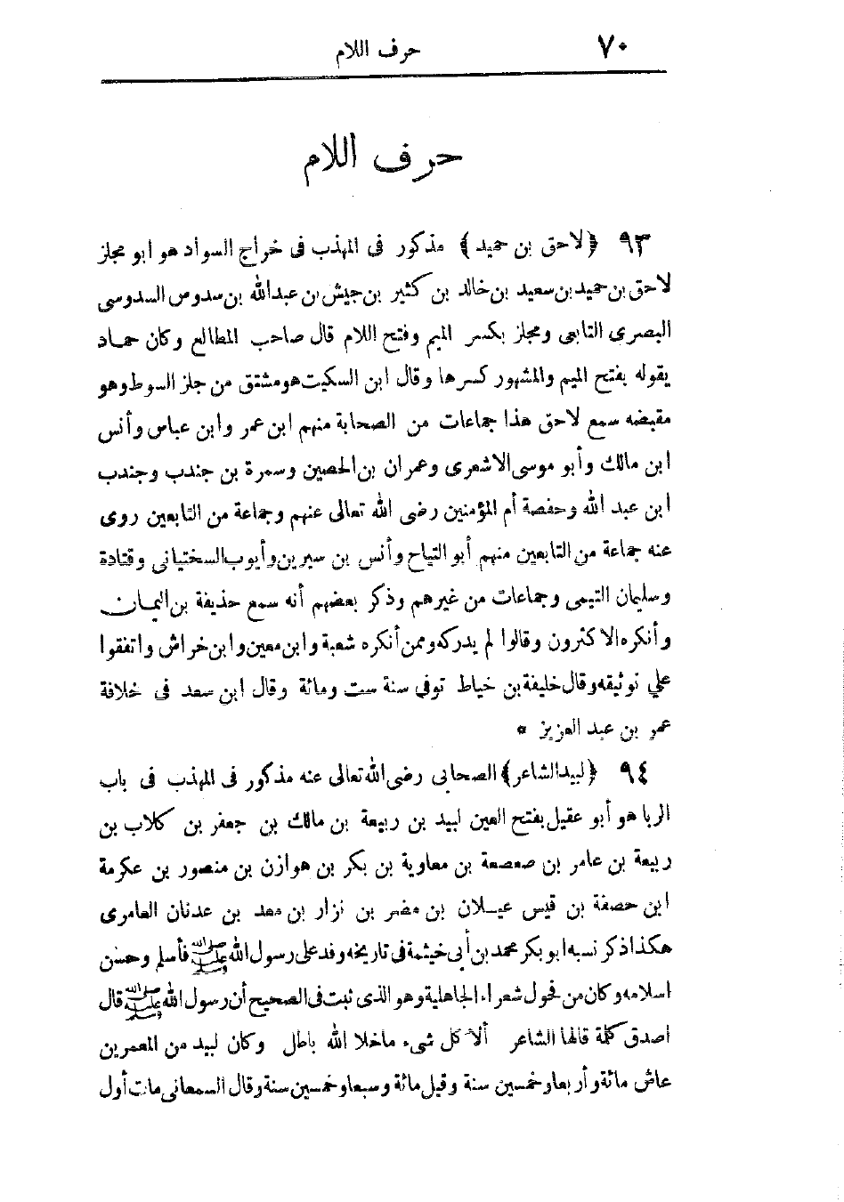 مذكور فى المهذب فى خراج السواد. هو أبو مجلز لاحق بن حميد بن سعيد بن خالد ابن كثير بن جيش بن عبد الله بن سدوس السدوسى البصرى التابعى، ومجلز بكسر الميم وفتح اللام. قال صاحب المطالع: وكان حماد يقوله بفتح الميم، والمشهور كسرها. وقال ابن السكيت: هو مشتق من جلز السوط، وهو مقبضه.