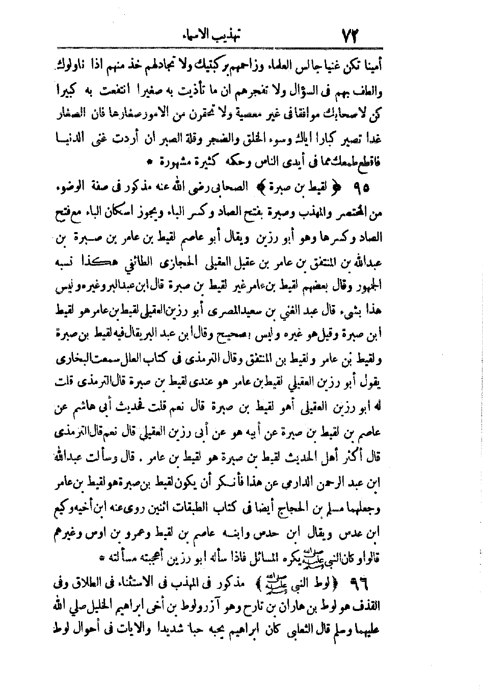 مذكور فى صفة الوضوء من المختصر والمهذب، وصبرة بفتح الصاد وكسر الباء، ويجوز إسكان الباء مع فتح الصاد وكسرها، وهو أبو رزين، ويقال: أبو عاصم لقيط بن عامر بن صبرة بن عبد الله بن المنتفق بن عامر بن عقيل العقيلى الحجازى الطائفى، هكذا نسبه الجمهور.