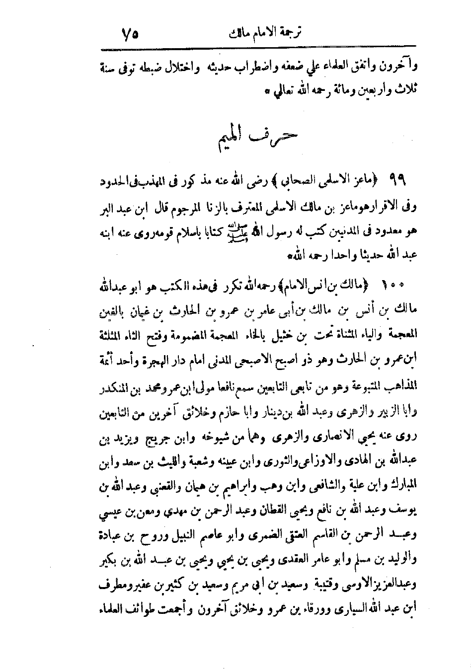 تكرر فى هذه الكتب. هو أبو عبد الله مالك بن أنس بن مالك بن أبى عامر بن عمرو بن الحارث بن غيمان، بالغين المعجمة والياء المثناة تحت، ابن خثيل، بالخاء المعجمة المضمومة وفتح الثاء المثلثة، ابن عمرو بن الحارث، وهو ذو أصبح الأصبحى المدنى، إمام دار الهجرة، وأحد أئمة المذاهب المتبوعة، وهو من تابعى التابعين. سمع نافعًا مولى ابن عمر، ومحمد بن المنكدر، وأبا الزبير، والزهرى، وعبد الله بن دينار، وأبا حازم، وخلائق آخرين من التابعين.