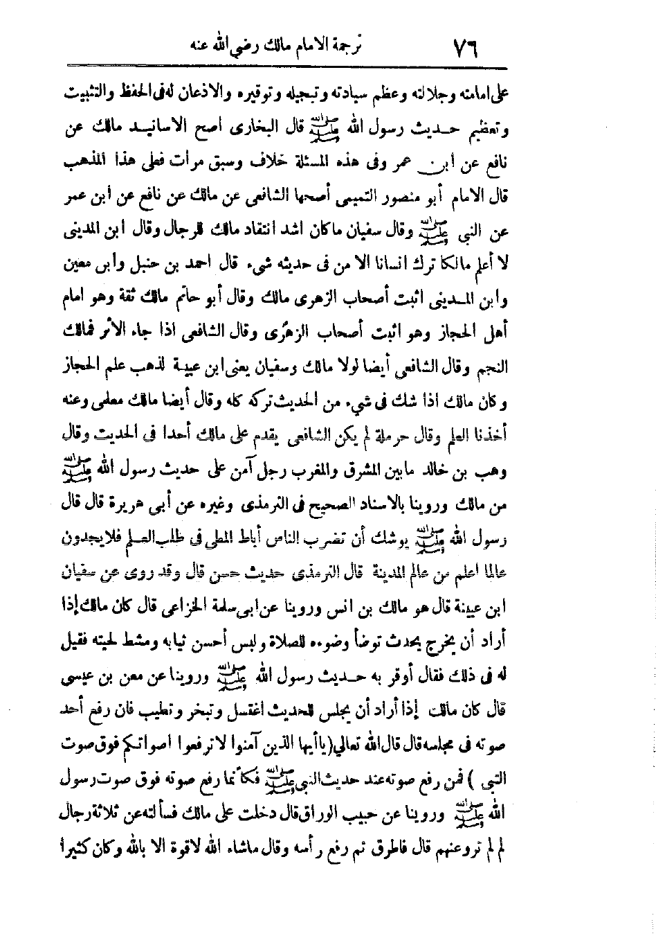 وروينا عن معن بن عيسى، قال: كان مالك إذا أراد أن يجلس للحديث اغتسل وتبخر وتطيب، فإن رفع أحد صوته فى مجلسه، قال: قال الله تعالى: {يَا أَيُّهَا الَّذِينَ آمَنُوا لاَ تَرْفَعُوا أَصْوَاتَكُمْ فَوْقَ صَوْتِ النَّبِىِّ} [الحجرات: 2] ، فمن رفع صوته عند حديث النبى - صَلَّى اللهُ عَلَيْهِ وَسَلَّمَ - فكأنما رفع صوته فوق صوت رسول الله - صَلَّى اللهُ عَلَيْهِ وَسَلَّمَ -.