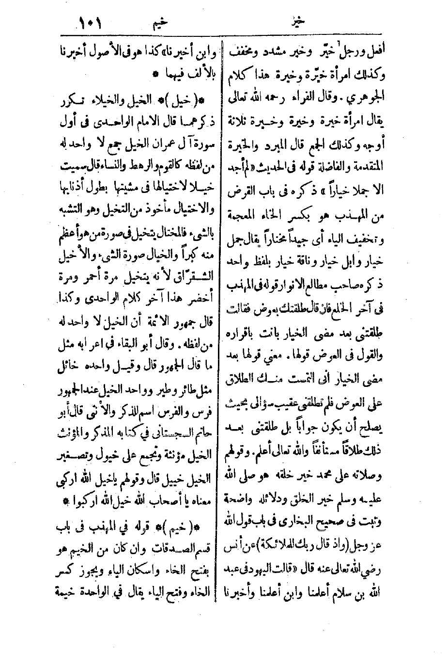 خيل: الخيل والخيلاء تكرر ذكرهما، قال الإمام الواحدي في أول سورة آل عمران الخيل، جمع لا واحد له من لفظه كالقوم والرهط والنساء. قال: سميت خيلا لاختيالها في مشيتها بطول أذنابها، والإختلال مأخذ من التخيل وهو التشبه بالشيء فالمختال يتخيل في صورة من هو أعظم منه كبرا، والخيال صورة الشيء، والأخيل الشقراق؛ لأنه يتخيل مرة أحمر ومرة أخضر، هذا آخر كلام الواحدي.