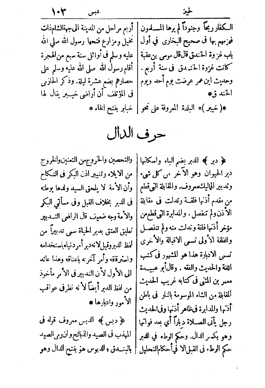 دبر: الدبر بضم الباء وإسكانها دبر الحيوان، وهو الآخر من كل شيء، وتدبير المماليك معروف. والمقابلة التي قطع من مقدم أذنها فلقة، وتدلت في مقابلة الأذن ولم تنفصل، والمدابرة التي قطع من مؤخر أذنها فلقة، وتدلت منه ولم تنفصل، والفلقة الأولى تسمى الأقبالة، والأخرى تسمى الأدبارة، هذا هو المهشور في كتب اللغة والحديث والفقه.