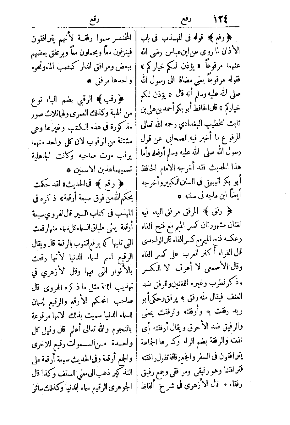 رقع: في الحديث: “لقد حكمت بحكم الله من فوق سبعة أرقعة” ذكره في المهذب في كتاب السير. قال الهروي: سبعة أرقعة يعني: طباق السماء كل سماء منها رقعت التي تليها كما يرقع الثوب بالرقعة، قال: ويقال الرقيع: اسم لسماء الدنيا؛ لأنها رقعت بالأنوار التي فيها.