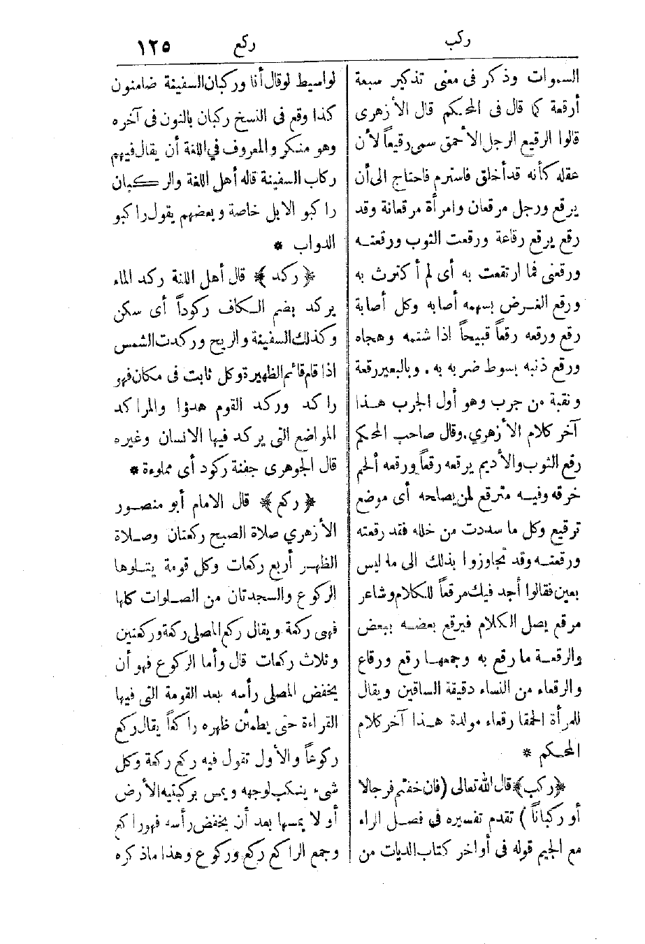 ركع: قال الإمام أبو منصور الأزهري: صلاة الصبح ركعتان، وصلاة الظهر أربع ركعات، وكل قومة يتلوها الركوع والسجدتان من الصلوات كلها فهي ركعة، ويقال: ركع المصلي ركعة وركعتين وثلاث ركعات، وأما الركوع فهو أن يخفض المصلي رأسه بعد القومة التي فيها القراءة حتى يطمئن ظهره راكعًا، يقال: ركع ركوعًا والأول تقول فيه ركع ركعة، وكل شيء ينكب لوجهه ويمس بركبتيه الأرض أو لا يمسها بعد أن يخفض رأسه فهو راكع، وجمع الراكع ركع وركوع، وهذا ما ذكره