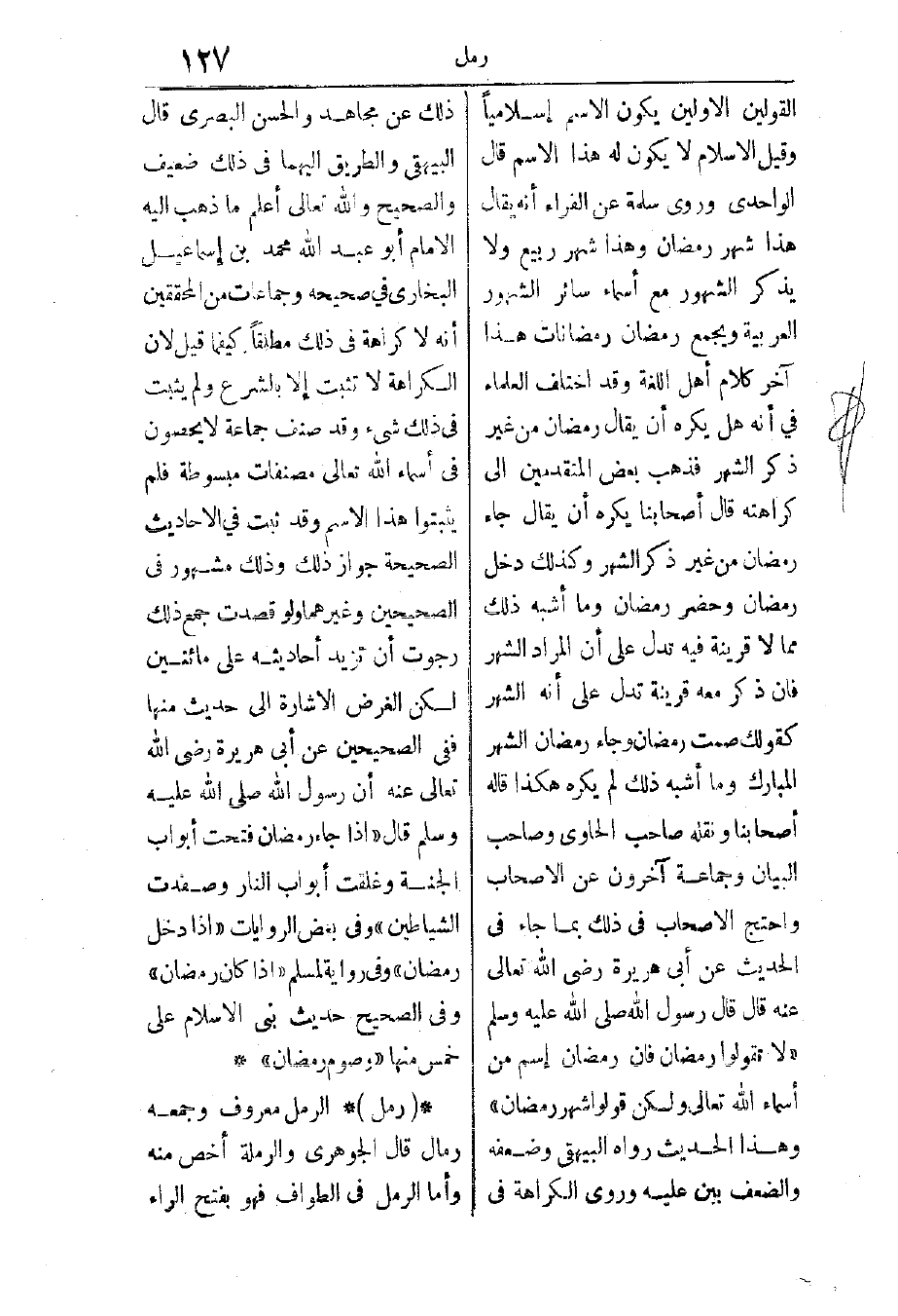 القولين الأولين يكون الاسم إسلاميًا، وقيل: الإسلام لا يكون له هذا الاسم. قال الواحدي: وروى سلمة عن الفراء: أنه يقال هذا شهر رمضان، وهذا شهر ربيع، ولا يذكر الشهور مع أسماء سائر الشهورة العربية ويجمع رمضان رمضانات، هذا آخر كلام أهل اللغة، وقد اختلف العلماء في أنه هل يكره أن يقال رمضان من غير ذكر الشهر فذهب بعض المتقدمين إلى كراهته، قال أصحابنا: يكره أن يقال جاء رمضان من غير ذكر الشهر، وكذلك دخل رمضان وحضر رمضان وما أشبه ذلك مما لا قرينة فيه تدل على أن المراد الشهر، فإن ذكر معه قرينة تدل على أنه الشهر كقولك صمت رمضان وجاء رمضان الشهر المبارك وما أشبه ذلك لم يكره، هكذا قاله أصحابنا. ونقله صاحب الحاوي وصاحب البيان وجماعة آخرون عن الأصحاب، واحتج الأصحاب في ذلك بما جاء في الحديث عن أبي هريرة رضي الله تعالى عنه قال: قال رسول الله - صَلَّى اللهُ عَلَيْهِ وَسَلَّمَ -: “لا تقولوا رمضان فإن رمضان اسم من أسماء الله تعالى، ولكن قولوا شهر رمضان” وهذا الحديث رواه البيهقي وضعفه، والضعف بين عليه، وروى الكراهة في ذلك عن مجاهد والحسن البصري.