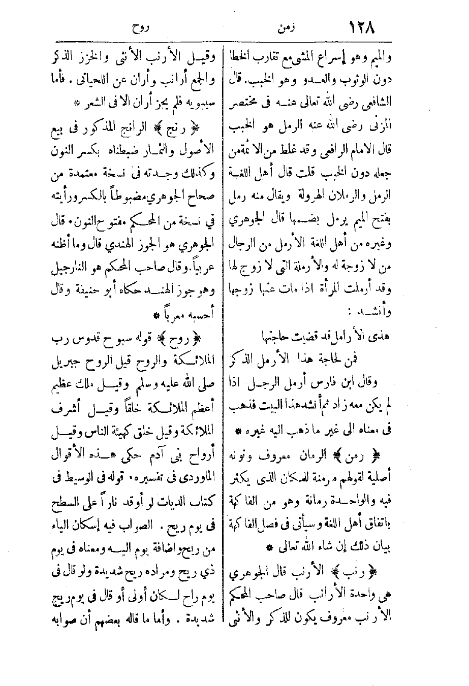 روح: قوله: سبوح قدوس رب الملائكة والروح، قيل: الروح جبريل عليه السلام، وقيل: ملك عظيم أعظم الملائكة خلقا، وقيل: أشرف الملائكة، وقيل: خلق كهيئة الناس، وقيل: أرواح بني آدم، حكى هذه الأقوال الماوردي في تفسيره قوله في الوسيط في كتاب الديات: لو أوقد نارا على السطح في يوم ريح، الصواب فيه إسكان الياء من ريح وإضافة يوم إليه، ومعناه: في يوم ذي ريح، ومراده ريح شديدة، ولو قال: في يوم راح لكان أولى، أو قال في يوم ريح شديدة، وأما ما قاله بعضهم: أن صوابه
