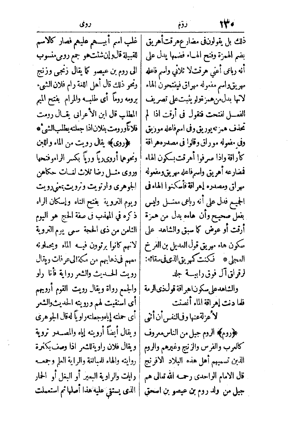 روى: يقال: رويت من الماء واللبن ونحوهما، أروى ريا وريا بكسر الراء وفتحها وروى مثل رضا ثلاث لغات حكاهن الجوهري، وارتويت وترويت بمعنى رويت ويوم التروية بفتح التاء وإسكان الراء، ذكره في المهذب في صفة الحج: هو اليوم الثامن من ذي الحجة سمي يوم التروية؛ لأنهم كانوا يرتوون فيه الماء ويحملونه معهم في ذهابهم من مكة إلى عرفات. ويقال: رويت الحديث والشعر رواية فأنا راو، والجمع رواة، ويقال: رويت القوم أرويهم أي: استقيت لهم، ورويته الحديث والشعر إي: حملته إياه وجعلته راويا له.