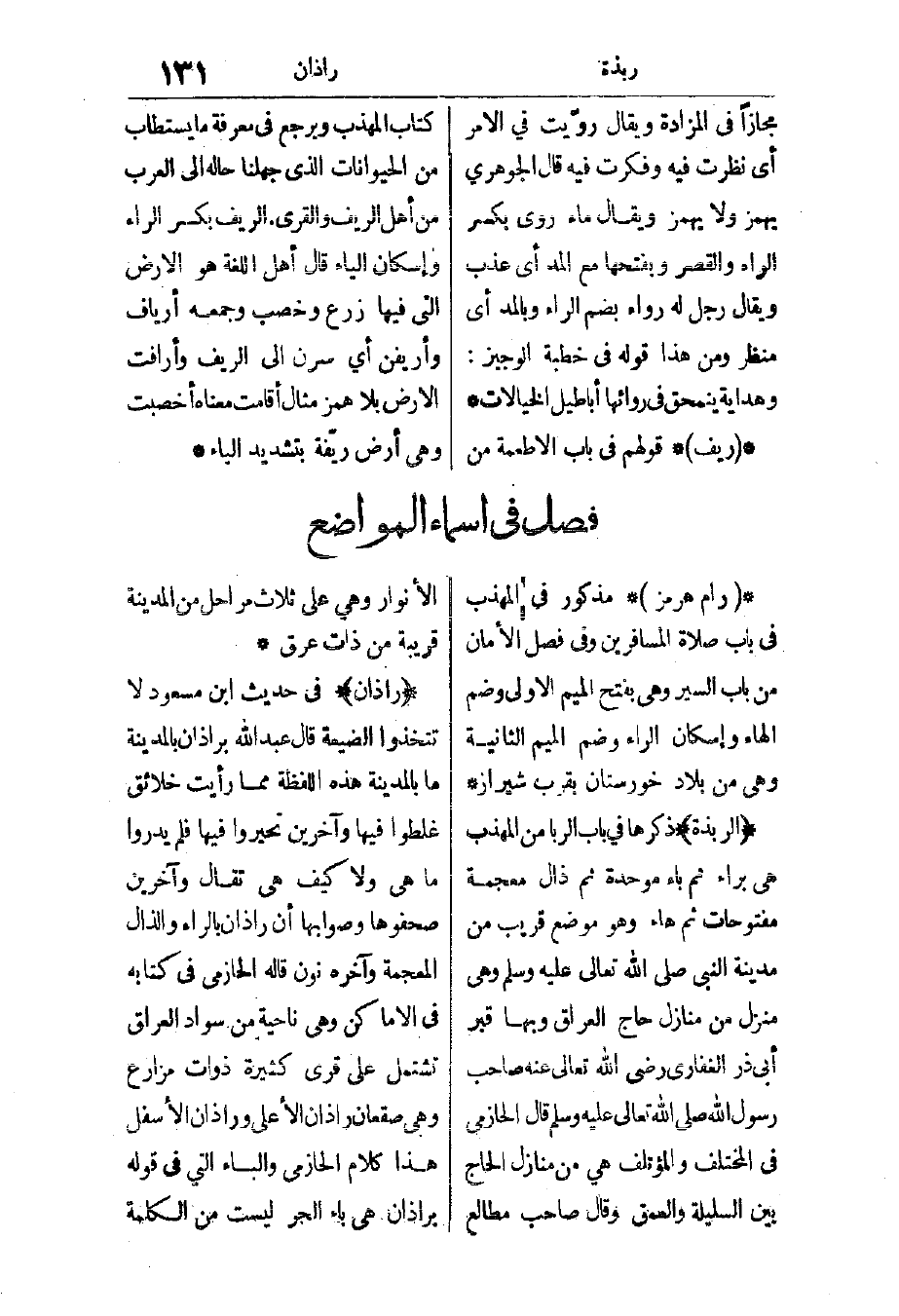 راذان: في حديث ابن مسعود: "لا تتخذوا الضيعة". قال عبد الله: براذان بالمدينة ما بالمدينة هذه اللفظة مما رأيت خلائق غلطوا فيها، وآخرين تحيروا فيها فلم يدروا ما هي ولا كيف هي تقال، وآخرين صحفوها، وصوابها: أن راذان بالراء والذال المعجمة وآخره نون، قاله الحازمي في كتابه في الأماكن.