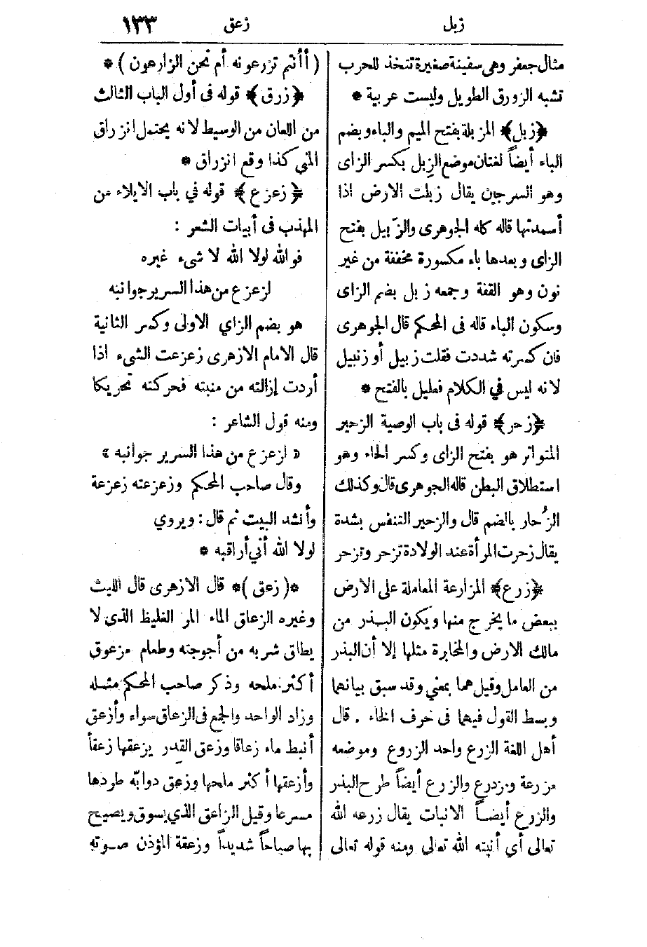 زعق: قال الأزهري: قال الليث وغيره: الزعاق الماء المر الغليظ الذي لا يطلق شربه من أجوجته، وطعام مزعوق أكثر ملحه، وذكر صاحب المحكم مثله، وزاد الواحد والجمع في الزعاق سواء، وأزعق أنبط ماء زعاقا، وزعق القدر يزعقها زعقًا، وأزعقها أكثر ملحها، وزعق دوابه طردها مسرعا. وقيل: الزاعق الذي يسوق ويصيح بها صياحًا شديدًا، وزعقة المؤذن صوته