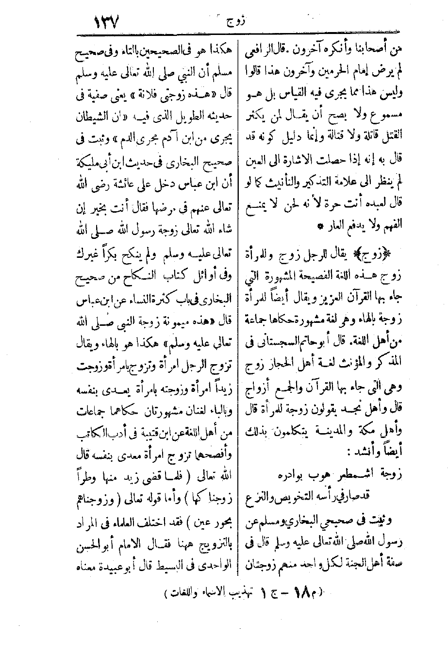 زوج: يقال للرجل زوج وللمرأة زوج، هذه اللغة الفصيحة المشهورة التي جاء بها القرآن العزيز، ويقال أيضًا: للمرأة زوجة بالهاء، وهي لغة مشهورة حكاها جماعة من أهل اللغة. قال أبو حاتم السجستاني في المذكر والمؤنث: لغة أهل الحجاز زوج، وهي التي جاء بها القرآن، والجمع أزواج، قال: وأهل نجد يقولون: زوجة للمرأة، قال: وأهل مكة والمدينة يتكلمون بذلك أيضًا، وأنشد: