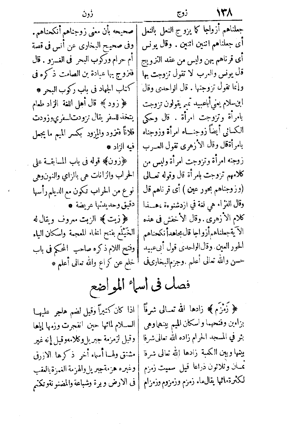 زمزم: زادها الله تعالى شرفًا بزاءين وفتحهما وإسكان الميم بينهما، وهي بئر في المسجد الحرام، زاده الله تعالى شرفًا بينها وبين الكعبة، زادها الله تعالى شرفًا ثمان وثلاثون ذراعا، قيل: سميت زمزم لكثرة مائها، يقال: ماء زمزم وزمزوم بانتساخ إذا كان كثيرًا، وقيل: لضم هاجر عليها السلام لمائها حين انفجرت وزمها إياها، وقيل: لزمزمة جبريل وكلامه، وقيل: إنه غير مشتق.