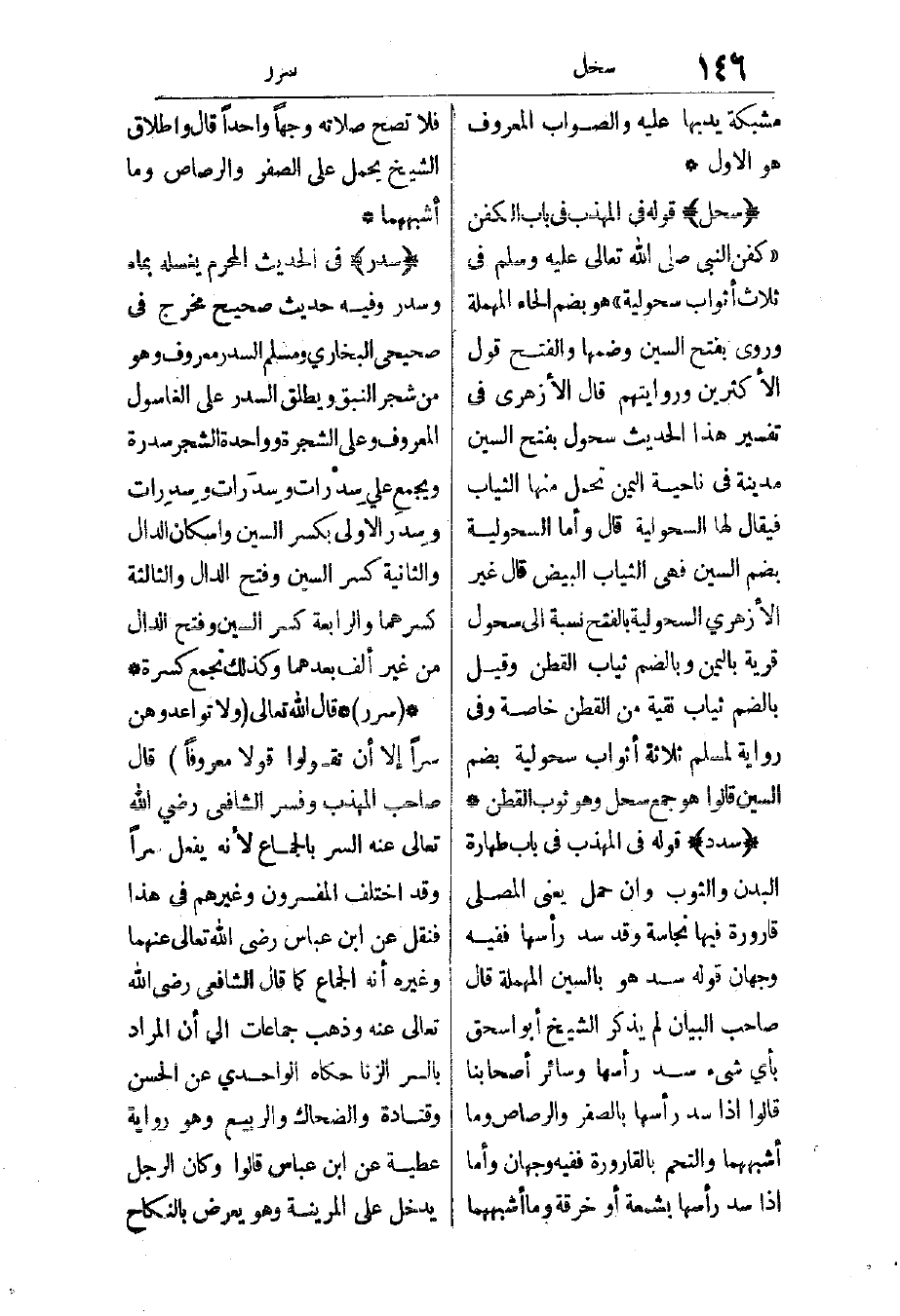 سحل: قوله في المهذب في باب الكفن "كفن النبي - صَلَّى اللهُ عَلَيْهِ وَسَلَّمَ - في ثلاث أثواب سحولية" هو بضم الحاء المهملة، وروي بفتح السين وضمها، والفتح قول الأكثرين وروايتهم. قال الأزهري في تفسير هذا الحديث: سحول بفتح السين مدينة في ناحية اليمن تحمل منها الثياب، فيقال لها السحولية، قال: وأما السحولية بضم السين فهي الثياب البيض، قال غير الأزهرى: السحولية بالفتح نسبة إلى سحول قرية ظاهرا، وبالضم ثياب القطن، وقيل: بالضم ثياب نقية من القطن خاصة، وفي رواية لمسلم: ثلاثة أثواب سحولية بضم السين، قالوا: هو جمع سحل وهو ثوب القطن.