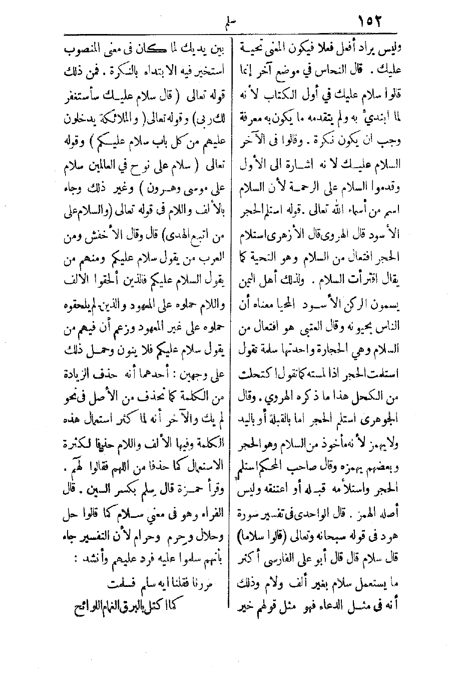 وقال الجوهري: استلم الحجر إما بالقبلة أو باليد، ولا يهمز؛ لأنه مأخوذ من السلام وهو الحجر، وبعضهم يهمزه. وقال صاحب المحكم: استلم الحجر واستلأمه قبله أو اعتنقه، وليس أصله الهمز. قال الواحدي في تفسير سورة هود في قوله سبحانه وتعالى: {قَالُوا سَلاماً} (هود: من الآية69) قال سلام. قال: قال: أكثر ما يستعمل سلام بغير ألف ولام، وذلك أنه في مثل الدعاء، فهو مثل قولهم: خير بين يديك، لما كان في معنى المنصوب استخير فيه الابتداء بالنكرة، فمن ذلك قوله تعالى: {قَالَ سَلامٌ عَلَيْكَ سَأَسْتَغْفِرُ لَكَ رَبِّي} (مريم: من الآية47) وقوله تعالى: {جَنَّاتُ عَدْنٍ يَدْخُلُونَهَا وَمَنْ صَلَحَ مِنْ آبَائِهِمْ وَأَزْوَاجِهِمْ وَذُرِّيَّاتِهِمْ وَالْمَلائِكَةُ يَدْخُلُونَ عَلَيْهِمْ مِنْ كُلِّ بَابٍ * سَلامٌ عَلَيْكُمْ بِمَا صَبَرْتُمْ فَنِعْمَ عُقْبَى الدَّارِ} (الرعد:24) وقوله تعالى: {سَلامٌ عَلَى نُوحٍ فِي الْعَالَمِينَ} (الصافات:79) {سَلامٌ عَلَى مُوسَى وَهَارُونَ} (الصافات:120) وغير ذلك، وجاء بالألف واللام في قوله تعالى: {وَالسَّلامُ عَلَى مَنِ اتَّبَعَ الْهُدَى} (طه: من الآية47) قال: وقال الأخفش: ومن العرب من يقول: سلام عليكم، ومنهم من يقول: السلام عليكم، فالذين ألحقوا الألف واللام حملوه على غير المعهود، والذين لم يلحقوه حملوه على غير المعهود، وزعم أن فيهم من يقول: سلام عليكم فلا ينون، وحمل ذلك على وجهين، أحدهما: أنه حذف الزيادة من الكلمة كما تحذف من الأصل في نحو لم يك. والآخر: أنه لما كثر استعمال هذه الكلمة وفيها الألف واللام حذفا لكثرة الاستعمال كما حذفا من اللهم فقالوا لهم. وقرأ حمزة، قال: سلم بكسر السين. قال الفراء: وهو في معنى سلام، كما قالوا: حل وحلال وحرم وحرام؛ لأن التفسير جاء بأنهم سلموا عليه فرد عليهم، وأنشد: