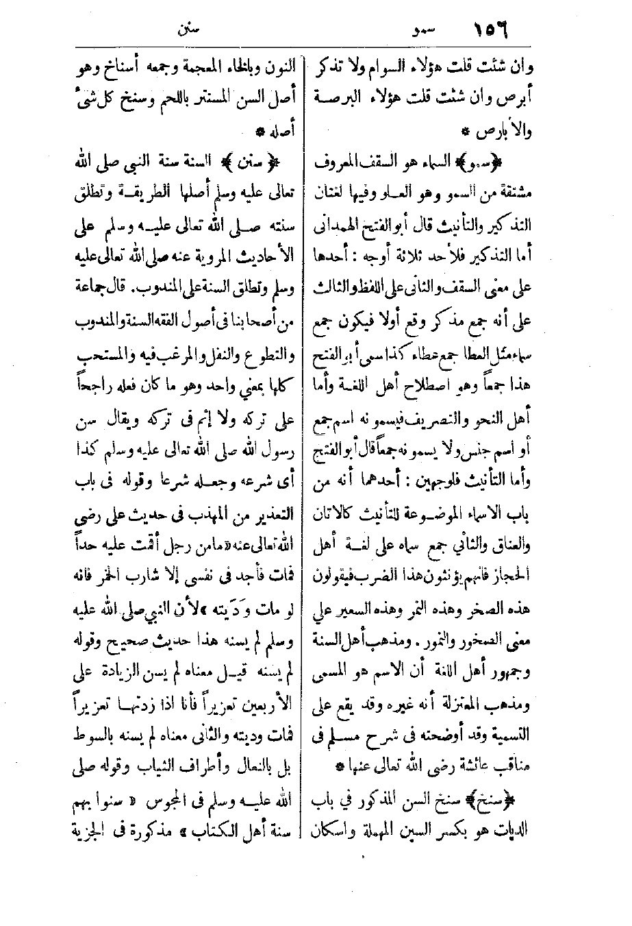 سنن: السنة سنة النبي - صَلَّى اللهُ عَلَيْهِ وَسَلَّمَ - أصلها الطريقة، وتطلق سنته - صَلَّى اللهُ عَلَيْهِ وَسَلَّمَ - على الأحاديث المروية عنه - صَلَّى اللهُ عَلَيْهِ وَسَلَّمَ -، وتطلق السنة على المندوب. قال جماعة من أصحابنا في أصول الفقه: السنة والمندوب والتطوع والنفل والمرغب فيه والمستحب كلها بمعنى واحد، وهو ما كان فعله راجحا على تركه ولا إثم في تركه، ويقال: سن رسول الله - صَلَّى اللهُ عَلَيْهِ وَسَلَّمَ - كذا أي: شرعه وجعله شرعا، وقوله في باب التعزير من المهذب في حديث علي رضي الله تعالى عنه: "ما من رجل أقمت عليه حدا فمات فأجد في نفسي إلا شارب الخمر فإنه لو مات وديته" لأن النبي - صَلَّى اللهُ عَلَيْهِ وَسَلَّمَ - لم يسنه، هذا حديث صحيح. وقوله: لم يسنه، قيل: معناه لم يسن الزيادة على الأربعين تعزيرًا فأنا إذا زدتها تعزيرًا فمات وديته، والثاني: معناه لم يسنه بالسوط بل بالنعال، وأطراف الثياب.