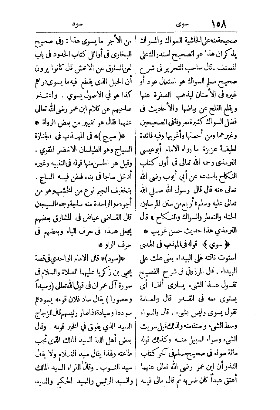 سوي: قوله في المهذب في الهدي "استوت ناقته على البيداء"، يعني: علت على البيداء. قال المرزوقي في شرح الفصيح: تقول هذا الشيء يساوي ألفًا أي: يستوي معه في القدر، قال: والعامة تقول: يسوى وليس بشيء. قال: والسواء وسط الشيء واستقامته، ولذلك قيل: سويت الشيء وسواء السبيل منه. وكذلك قوله مائة سواء في صحيح مسلم في آخر كتاب النذر: أن ابن عمر رضي الله تعالى عنهما أعتق عبدًا كان ضربه، ثم قال: ما لي فيه من الأجر ما يسوى هذا. وفي صحيح البخاري في أوائل كتاب الحدود في باب لعن السارق عن الأعمش، قال: أن الحبل الذي يقطع فيه ما يسوى دراهم، كذا هو في الأصول يسوي، واعتذر صاحبهم عن كلام ابن عمر رضي الله تعالى عنهما، فقال: هو تغيير من بعض الرواة.