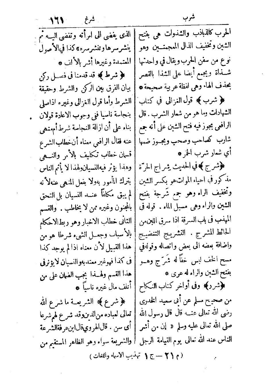شرج: في الحديث “شِراج الحرة” مذكور في إحياء الموات، هو بكسر الشين وتخفيف الراء، وهو جمع شرجة بفتح الشين والراء، وهي مسيل الماء. قوله في المهذب في باب السرقة: إذا سرق اللبن من الحائط المشرج. التشريج: التنضيج، وإضافة بعضه إلى بعض واتصاله، وقوله: في مسح الخف لبس خفا له شرج، وهو بفتح الشين والراء له عرى.
