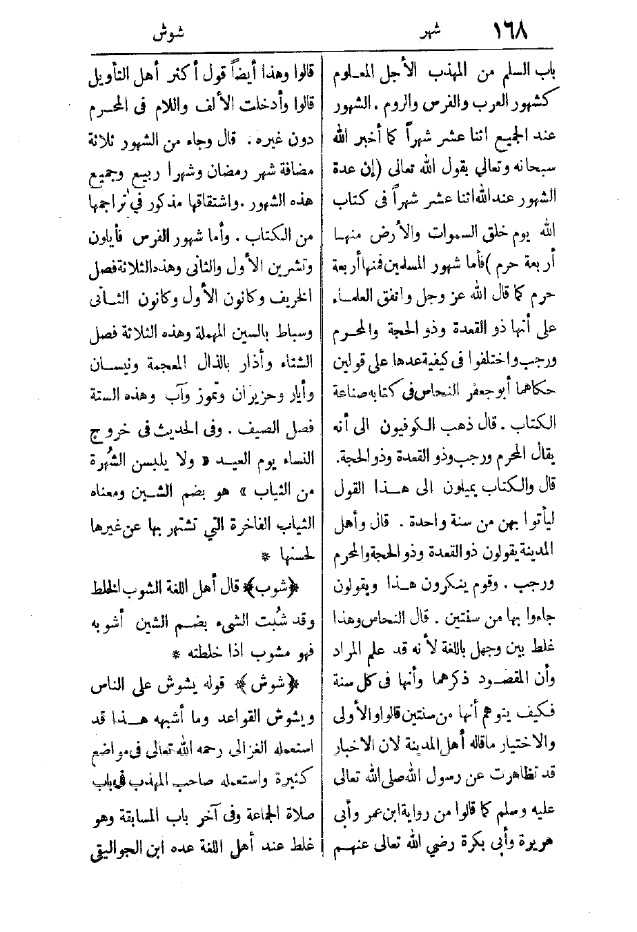 وأما شهور الفرس فأيلول وتشرين الأول والثاني، وهذه الثلاثة فصل الخريف وكانون الأول وكانون الثاني وسباط بالسين المهملة، وهذه الثلاثة فصل الشتاء وآذار بالذال المعجمة ونيسان وأيار وحزيران وتموز وآب وهذه الستة فصل الصيف. وفي الحديث في خروج النساء يوم العيد “ولا يلبسن الشهرة من الثياب” هو بضم الشين ومعناه: الثياب الفاخرة التي تشتهر بها عن غيرها لحسنها.