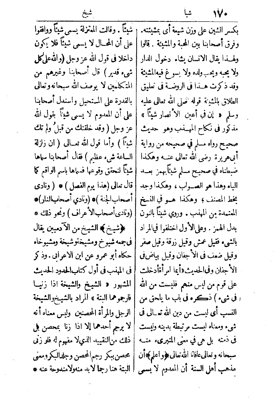 شيخ: الشيخ من الآدميين، يقال في جمعه شيوخ ومشيخة وشيخة ومشيوخاء، حكاه أبو عمرو عن ابن الأعرابي، وذكر في المهذب في أول كتاب الحدود الحديث المشهور: "الشيخ والشيخة إذا زنيا فارجموهما البتة" المراد: بالشيخ والشيخة الرجل والمرأة المحصنين، وليس معناه أنه لا يرجم أحدهما إلا إذا زنا بمحصن بل ذلك من التقييد الذي لا مفهوم له، فلو زنى محصن ببكر رجم المحصن وجلد البكر، ومعنى البتة هنا رجما لا بد منه ولا مندوحة عنه.
