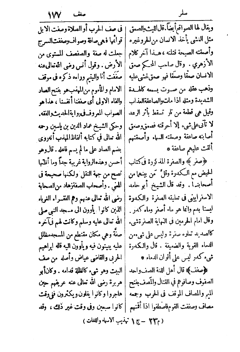 صفف: قال أهل اللغة: الصف واحد الصفوف، وصافوهم في القتال والمصف بفتح الميم، والمصاف الموقف في الحرب وجمعه مصاف، وصففت القوم فاصطفوا إذا أقمتهم في صف الحرب أو الصلاة، وصفت الإبل قوائمها فهي صافة وصواف، وصففت السرج جعلت له صفة، والصفصف المستوى من الأرض. وقول أنس رضي الله تعالى عنه: صففت أنا واليتيم وراءه، ذكره في موقف الإمام والمأموم من المهذب هو بفتح الصاد والفاء الأولى أي: صففنا أنفسنا، هذا هو الصواب المعروف في رواية الحديث والفقه.