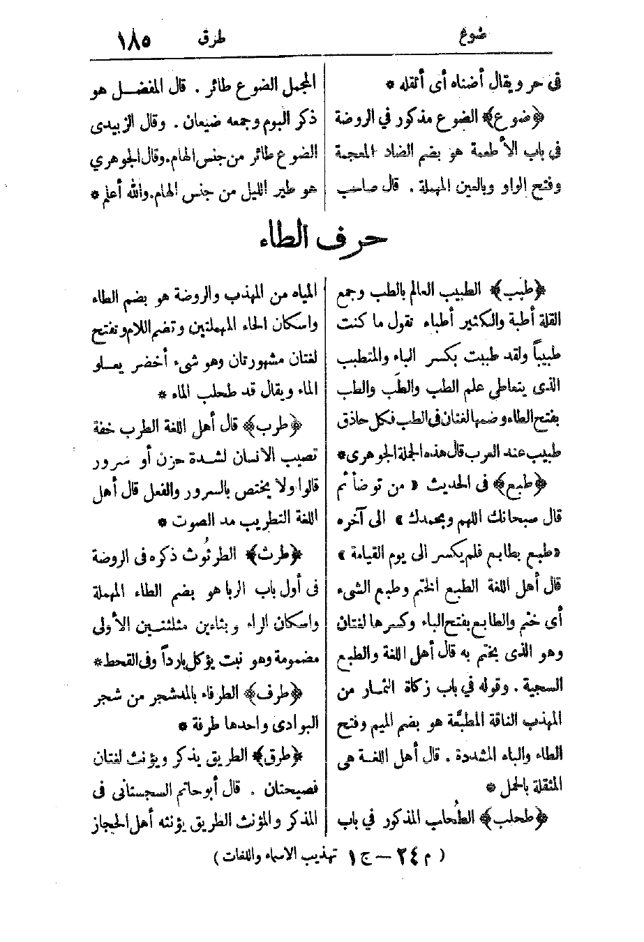 طبع: في الحديث: “من توضأ ثم قال سبحانك اللهم وبحمدك” إلى آخره “طبع بطابع فلم يكسر إلى يوم القيامة”. قال أهل اللغة: الطبع الختم، وطبع الشيء أي: ختم، والطابع بفتح الباء وكسرها لغتان، وهو الذي يختم به. قال أهل اللغة: والطبع السجية. وقوله في باب زكاة الثمار من المهذب: الناقة المطبعة هو بضم الميم وفتح الطاء والباء المشددة. قال أهل اللغة: هي المثقلة بالحمل.