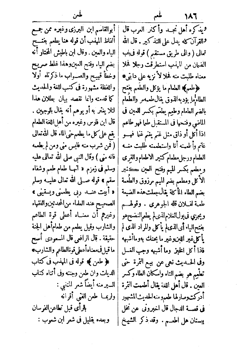 طعم: الطعام ما يؤكل، والطعم بفتح الطاء ما يؤديه الذوق، يقال: طعمه مر، والطعام بالضم الطعام، وطعم يطعم بكسر العين في الماضي، وفتحها في المستقبل طعما، فهو طاعم إذا أكل أو ذاق مثل غنم يغنم غنما فهو غانم، وأطعمته أنا واستطعمته طلبت منه الطعام، ورجل مطعام كثير الاطعام والقرى، ومطعم بكسر الميم وفتح العين كثير الأكل، ومطعم بضم الميم مرزوق، والطعمة بضم الطاء المأكلة، يقال: جعلت هذه الضيعة طعمة لفلان، قاله الجوهري.