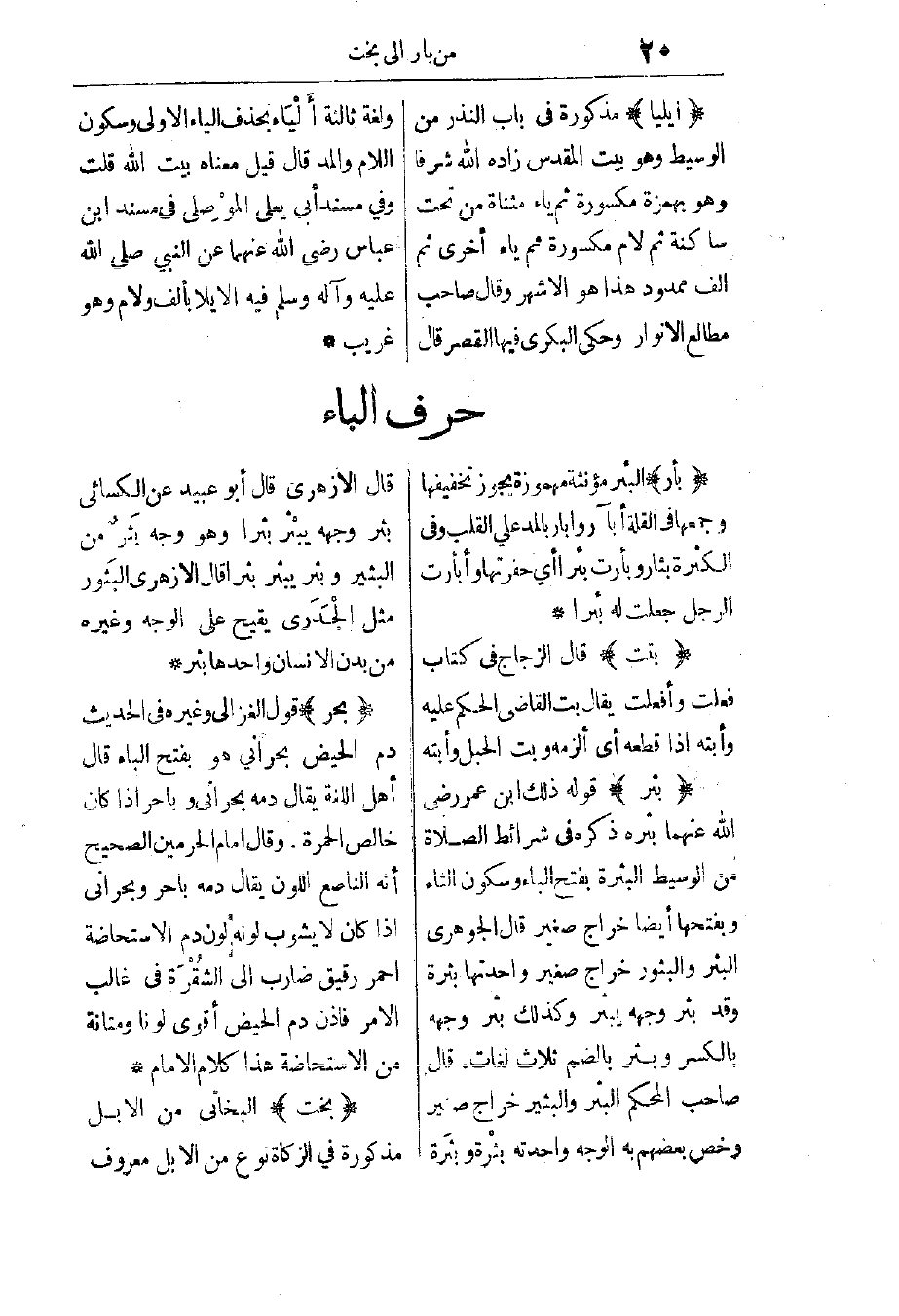 بحر: قول الغزالي وغيره في الحديث دم الحيض بحراني، هو بفتح الباء. قال أهل اللغة: يقال دمه بحراني وباحر إذا كان خالص الحمرة. وقال إمام الحرمين: الصحيح أنه الناصع اللون، يقال دمه باحر وبحراني إذا كان لا يشوب لونه لون دم الاستحاضة، أحمر رقيق ضارب إلى الشُقْرَة في غالب الأمر، فإذن دم الحيض أقوى لونًا ومتانة من الاستحاضة، هذا كلام الإمام.