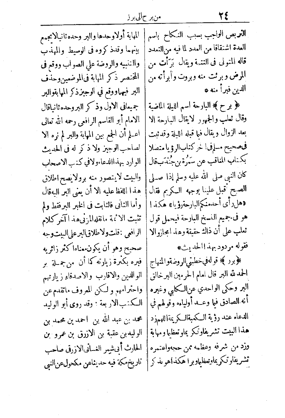 برر: قوله في خطبتي “الروضة” و“المنهاج”: الحمد لله البر. قال إمام الحرمين: البر خالق البر، وحكى الواحدي وغيره أنه الصادق فيما وعد أولياءه، وقولهم في الدعاء عند رؤية الكعبة الكريمة: اللهم زد هذا البيت تشريفًا وتكريمًا وتعظيمًا ومهابة، وزد من شرفه وعظمه ممن حجه واعتمره تشريفًا وتكريمًا وتعظيمًا وبرًا. هكذا هو يذكر المهابة أولاً وحدها، والبر وحده ثانيًا لا يجمع بينهما، وقد ذكروه في “الوسيط” و“المهذب” و“التنبيه” و“الروضة” على الصواب، ووقع في “المختصر” ذكر المهابة في الموضعين، وحذف البر فيهما، ووقع في “الوجيز” ذكر المهابة والبر جميعًا في الأول، وذكر البر وحده ثانيًا.