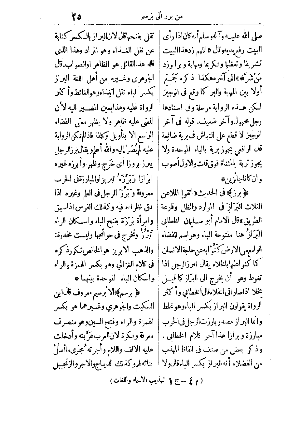 برز: في الحديث: “اتقوا الملاعن الثلاث: البَرَازَ في الموارد، والظل، وقارعة الطريق” قال الإمام أبو سليمان الخطابي: البَرَازُ هنا مفتوحة الباء وهو اسم للفضاء الواسع من الأرض كَنَّوْا به عن حاجة الإنسان كما كنوا عنها بالخلاء، يقال: تبرز الرجل إذا تَغوَّط، وهو أن يخرج إلى البراز كما قيل يخلا إذا صار إلى الخلاء. قال الخطابي: وأكثر الرواة يقولون: البراز بكسر الباء، وهو غلط، وإنما البراز: مصدر بارزت الرجل في الحرب مبارزة، وبرازا، هذا آخر كلام الخطابي.