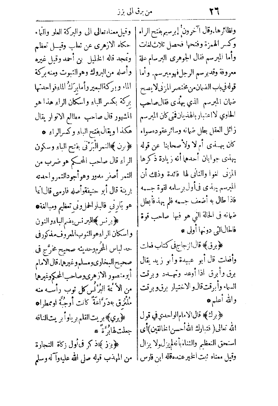 برك: قال الإمام الواحدي في قول الله تعالى: {فَتَبَارَكَ اللَّهُ أَحْسَنُ الْخَالِقِينَ} (المؤمنون: من الآية14) أي استحق التعظيم والثناء بأنه لم يزل ولا يزال، وقيل: معناه ثبت الخير عنده، قاله ابن فارس. وقيل: معناه تعالى إلى، والبركة العلو والنماء. حكاه الأزهري عن ثعلب، وقيل: تعظم وتمجد. قاله الخليل بن أحمد، وقيل غيره. وأصله من البروك، وهو الثبوت، ومنه بركة الماء وبركة البعير، وأما برَكُ الماءِ فواحدتها بِركة بكسر الباء وإسكان الراء، هذا هو المشهور.