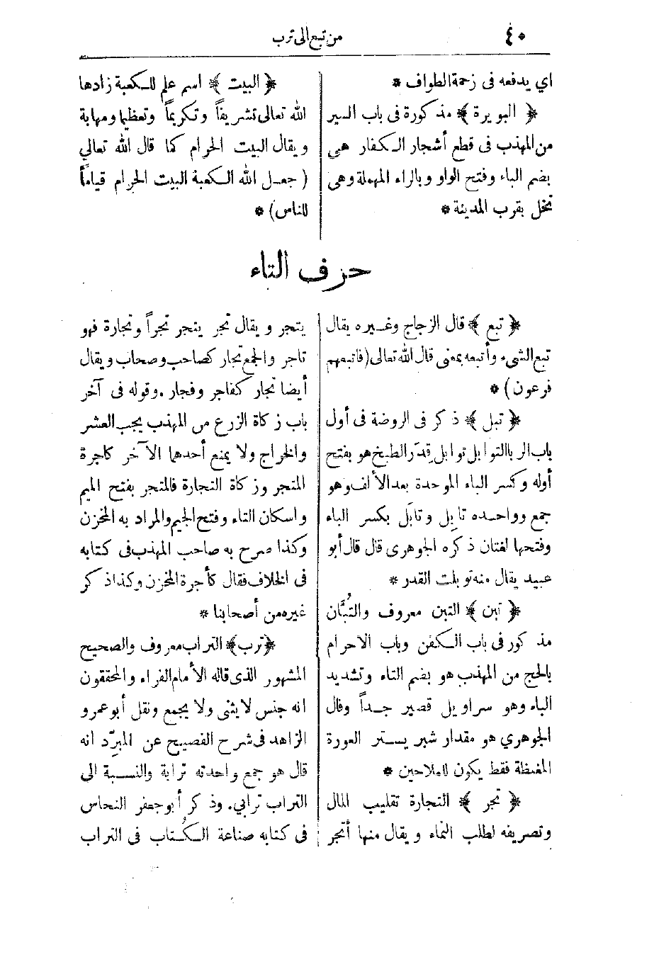 ترب: التراب معروف، والصحيح المشهور الذي قاله الإمام الفراء والمحققون أنه جنس لا يثنى ولا يجمع، ونقل أبو عمرو الزاهد في "شرح الفصيح" عن المبرد أنه قال: هو جمع واحدته ترابة، والنسبة إلى التراب ترابي.
