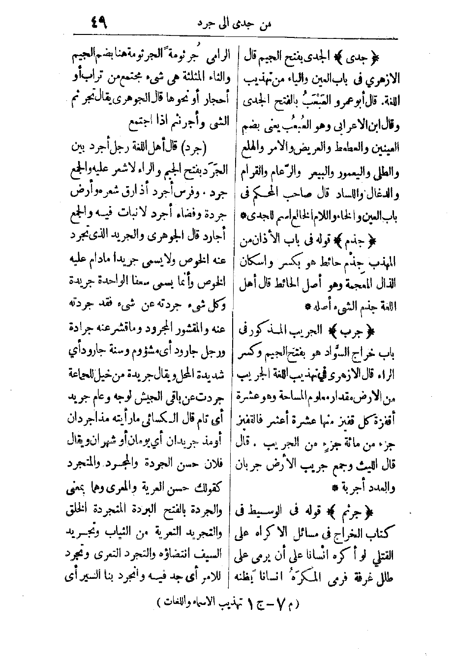 جرد: قال أهل اللغة: رجل أجرد بين الجرد بفتح الجيم والراء لا شعر عليه، والجمع جرد، وفرس أجرد إذا رق شعره، وأرض جردة، وفضاء أجرد لا نبات فيه والجمع أجارد.